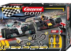 Das Carrera GO!!! „Max Speed“-Set sorgt mit den schnittigen Formel-1-Rennwagen von den Profis Hamilton und Verstappen auf einer Rennstrecke von 6,3 Metern für atemberaubenden Autorennspaß.