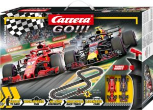 Im Carrera GO!!! „Race to Win“-Set geben sich die Formel-1-Stars Sebastian Vettel in seinem Ferrari SF71H und Max Verstappen in seinem Red Bull Racing RB14 die Ehre. Als jüngster Fahrer, der jemals bei der Formel-1 antrat, hat sich Max Verstappen in kürzester Zeit einen Namen in der Rennszene gemacht. Auf der 4,3 Meter langen Rennstrecke ist Top-Speed die Zauberformel, also Gas, Gas, Gas!
