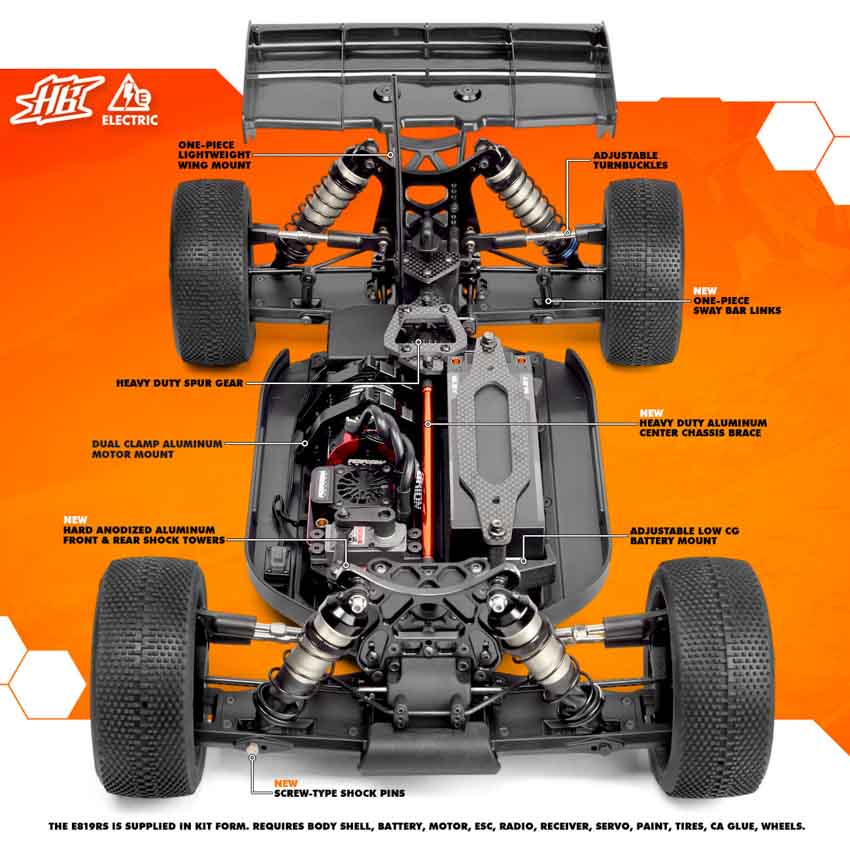 Neu von HB Racing ist der Elektro 1/8 Buggy E819RS. Der E819RS basiert auf dem E819 mit einigen neuen Teilen.Zu den wichtigsten Updates gehört eine neue V3-Dämpferbrücke, mit der die Spoilerhöhe und die Höhe der Karosseriehalterung angepasst werden kann, dann Lenkhebel, Radträger uvm..
