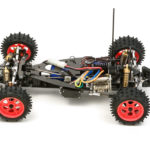 Diese neu aufgelegte Version von Tamiyas legendärem Avante-Buggy von 1988 zeigt das coole Farbschema des Mini 4WD Avante Black Special. Spike-Reifen auf leichten Felgen in leuchtendem Neon-Pink sind dabei.