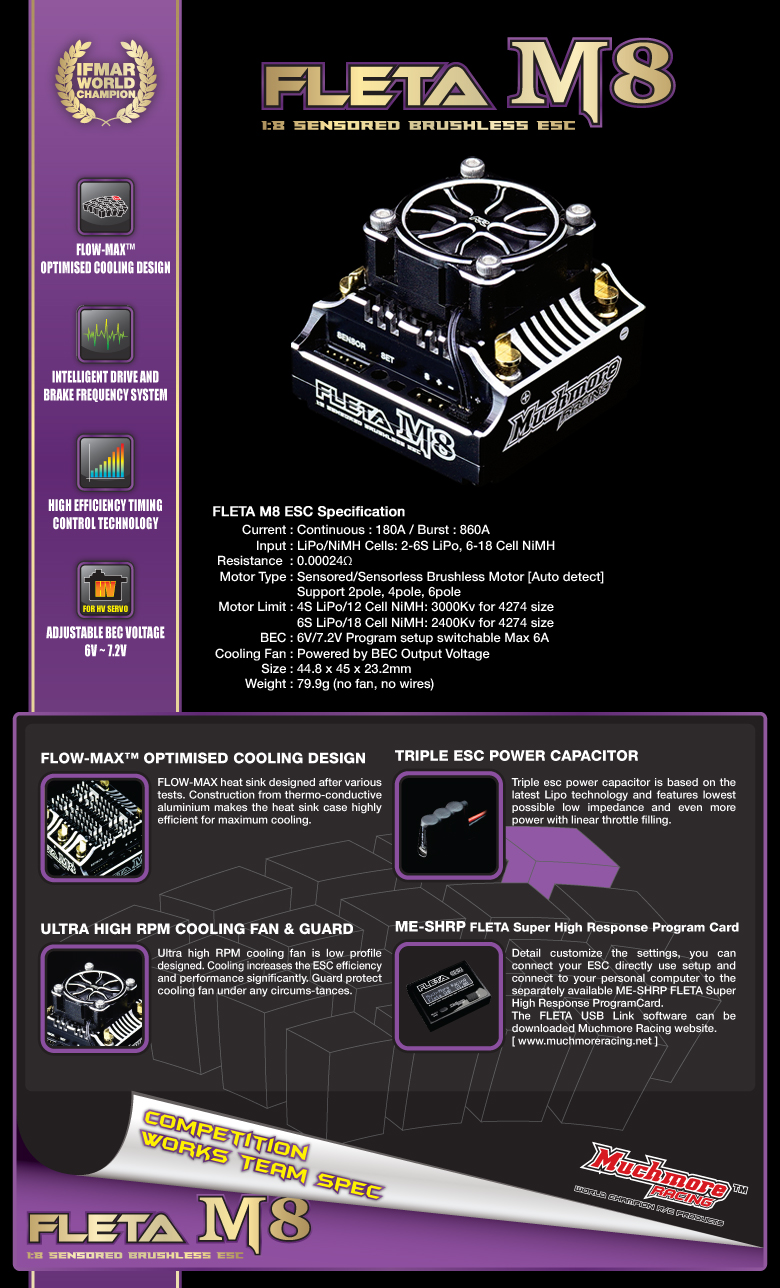 FLETA M8 Competition heißt der neue Fahrregler von Muchmore für 1/8 Elektrofahrzeuge. Der neue Regler kommt im schicken schwarzen Design, Kühlkörper aus Aluminium mit Lüfter und istmit einem Programmiergerät oder PC einstellt werden.