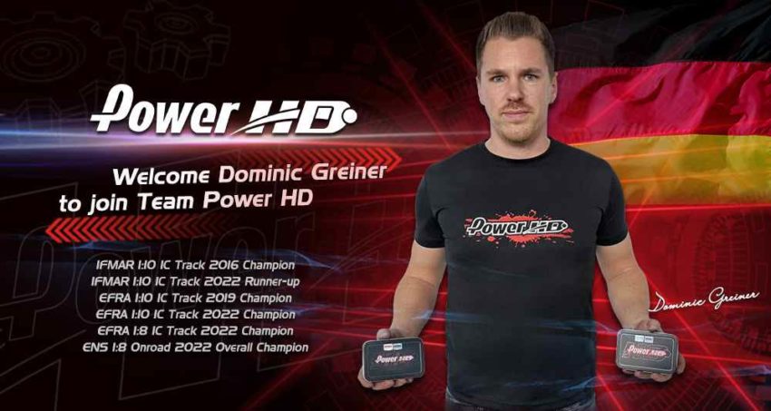 Power HD is thrilled to announce that the world champion Dominic Greiner RC has joined the Power HD team. Dominic is the 2016 IFMAR 1:10 IC Track WC Champion and the 2022 IFMAR1:10 IC Track WC Runner-up. He has also won the EFRA IC Track champion for 3 times + ENS – Euro Nitro Series 2022 1:8 GP overall champion. Not only that, he also won the P7 in the 2024 IFMAR ISTC WC. He will use the GTS-2 in his 1:10 el. track and 1:8 el. and fronti car. Power HD has won the trust of so many world champions !