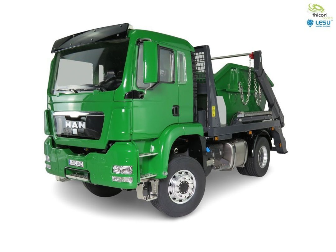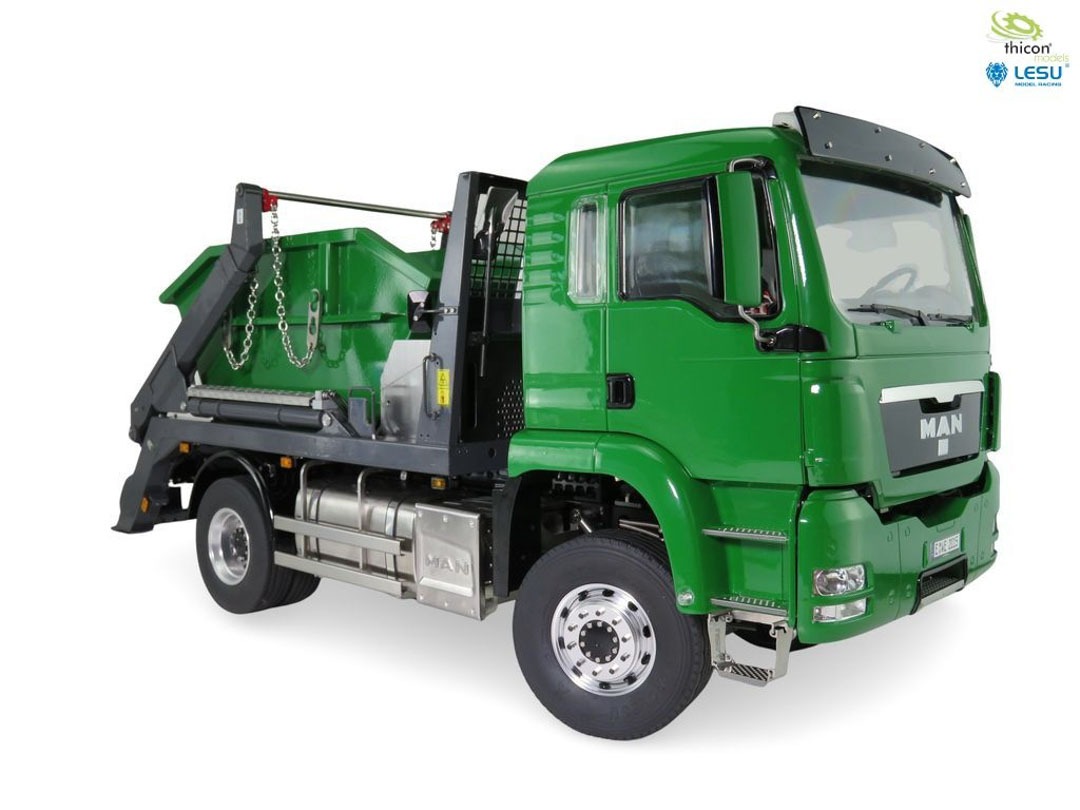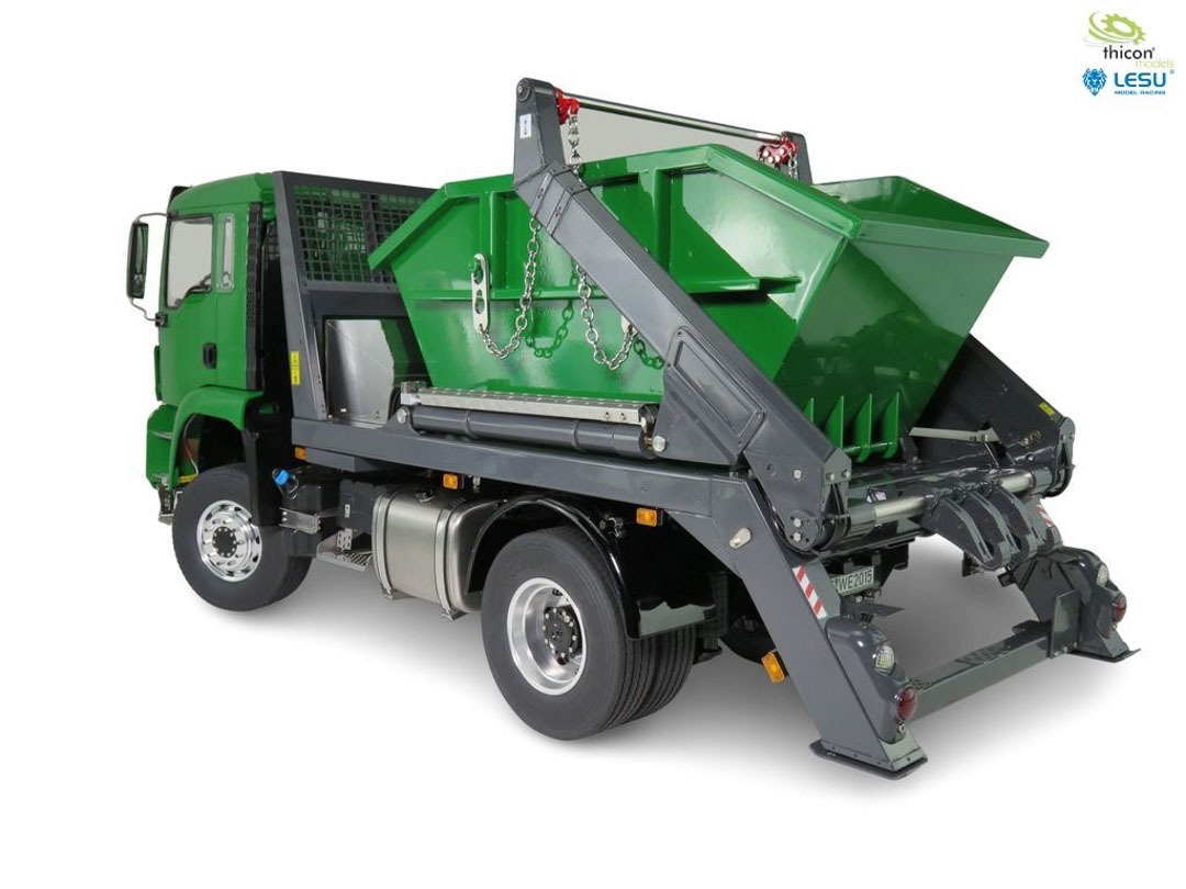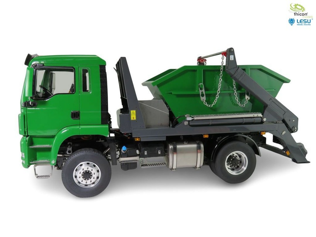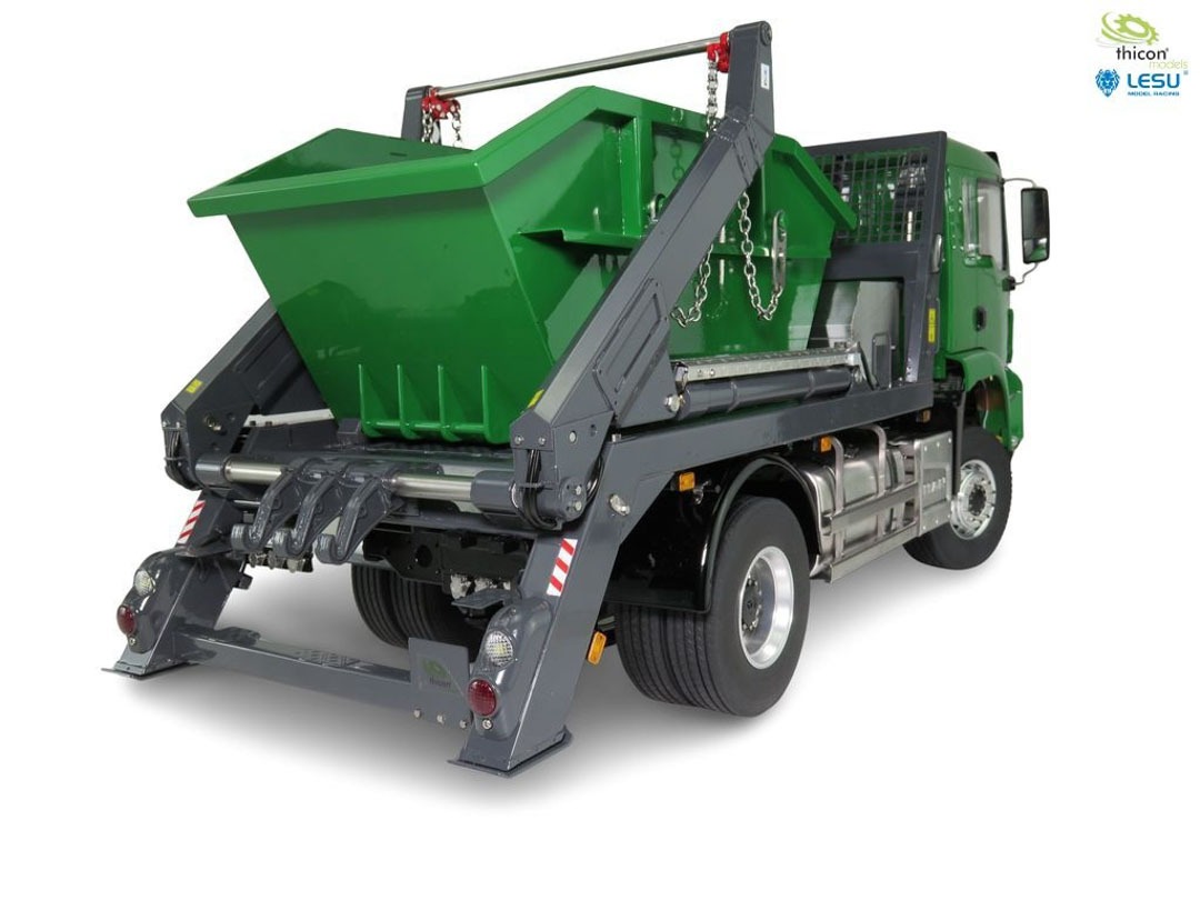 Lieferung: MAN 4×4 Absetzkipper fertig gebaut und grün/grau lackiert, mit1x Container, Hydraulik, Servos und Regler.