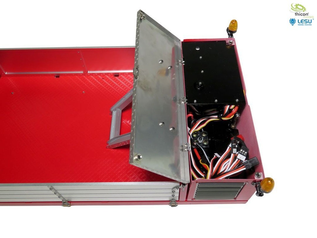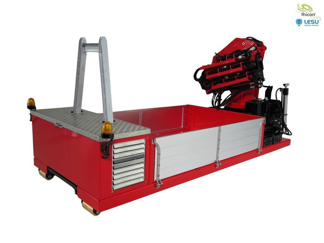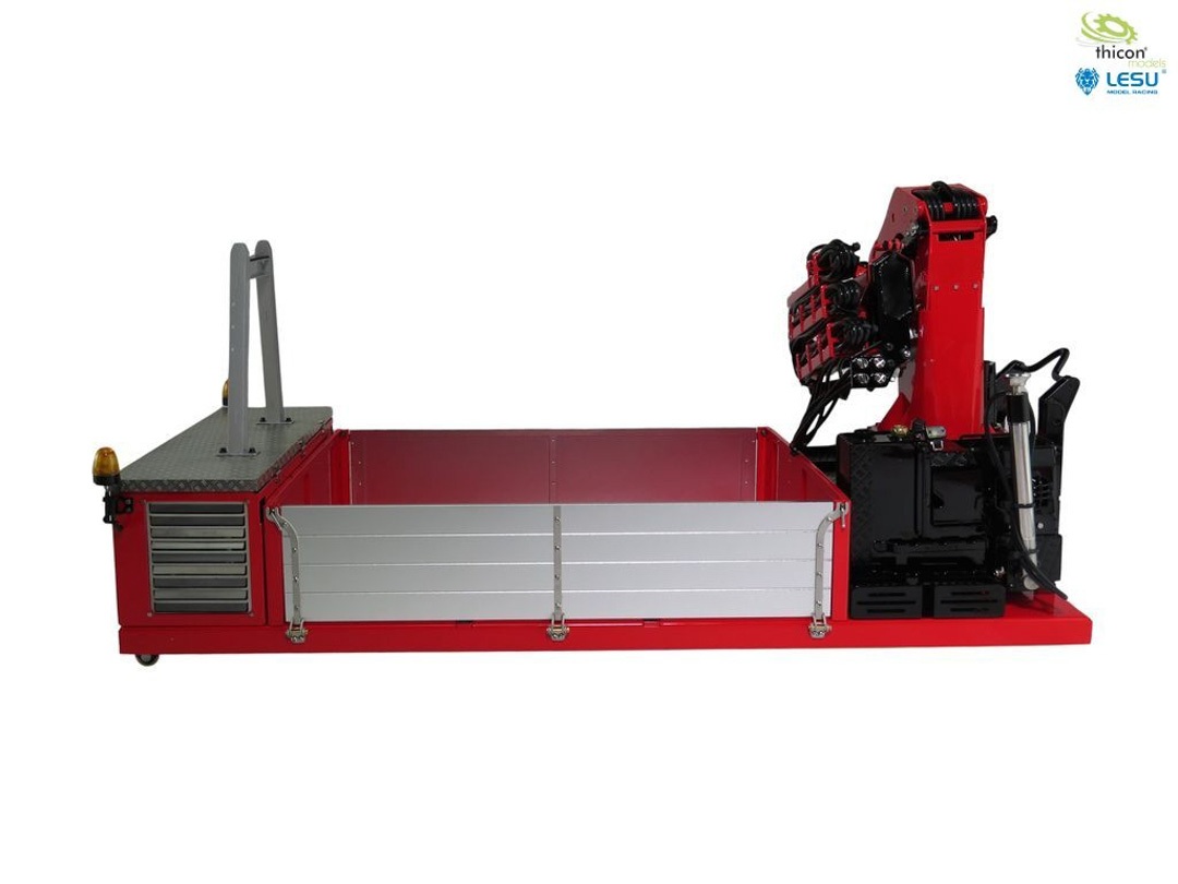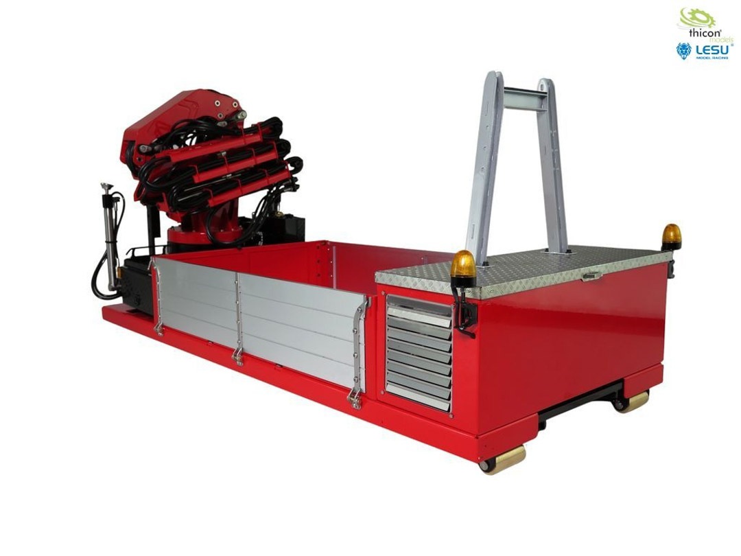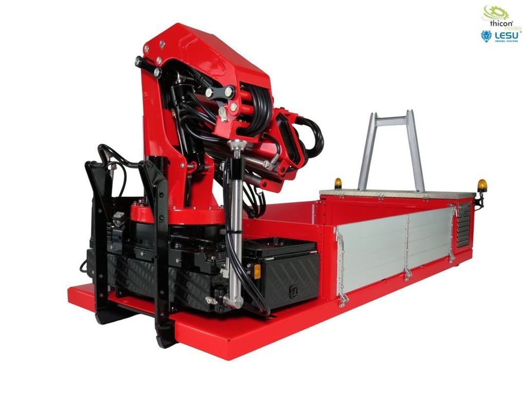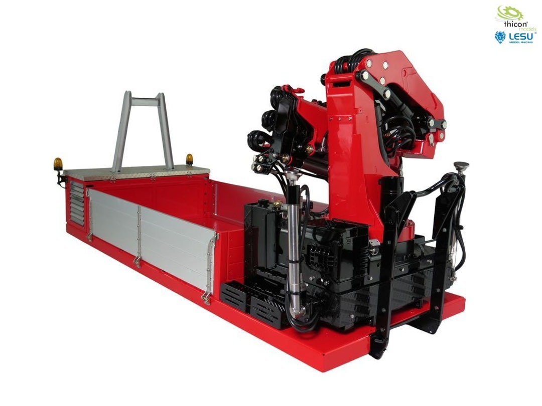 Diesen Abrollaufbau mit Ladekran gibt es bei thicon-models passend für alle LESU Abroller. Der Aufbau ist fertig aufgebaut und in rot lackiert. Die gesamte Hydraulik ist auf der Plattform montiert.