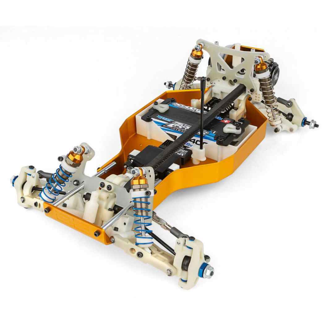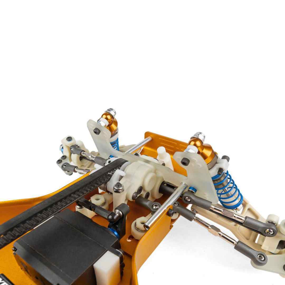 Die Einzelradaufhängung mit harteloxierten Coilover-Dämpfern bügelt die Unebenheiten der Strecke glatt. Präzise gefertigte Nylon-Aufhängungsteile lassen sich bei Bedarf sogar individuell einfärben. Das lange Design der vorderen Querlenker-/Kugelgelenk-Konstruktion ermöglicht umfangreiche Setup-Einstellungen wie Sturz, Sturzanstieg, Nachlauf, Bodenfreiheit und Federhärte, damit Sie Ihr Fahrzeug an jede Strecke optimal anpassen können.