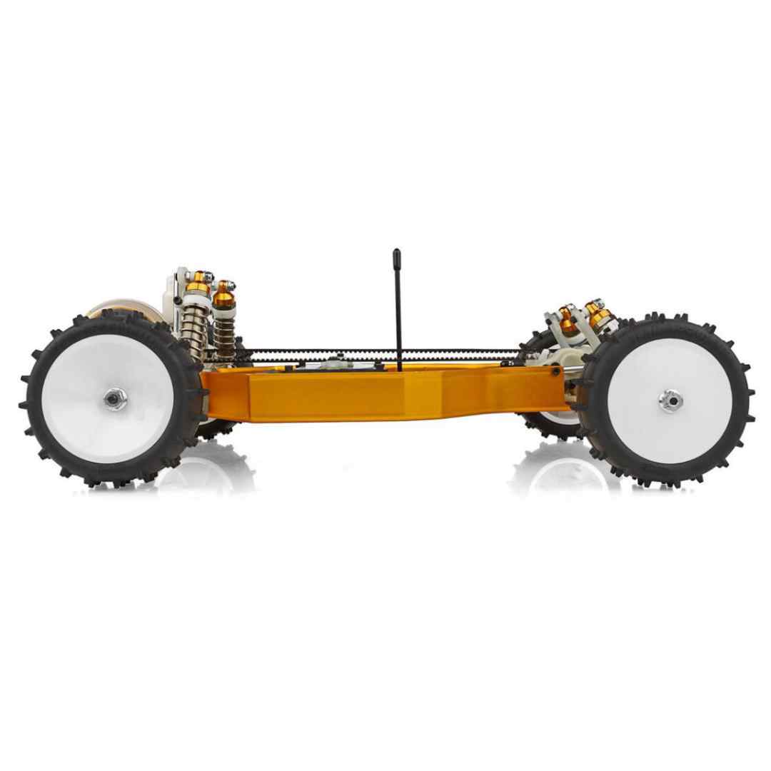 Im Kit enthalten sind eine transparente Polycarbonat-ProTech-Karosserie mit Fahrerfigur, ein 5,5 Zoll breiter Downforce-Heckflügel, ein vollständiger Kugellagersatz, CVA-Antriebswellen, Vintage 4WD-Stollenreifen sowie das klassische goldfarben eloxierte 6061-T6-Monocoque-Wannenchassis.