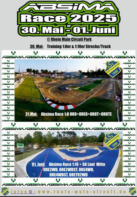 Am letzten Maiwochenende steht ein Doppelevent beim ESV Bischofsheim auf dem Rhein Main Circuit mit dem Absima Race 2025 an. Das Rennwochenend beginnt am Freitag bereits mit einem Trainingstag für alle Klassen, die am Wochenende gefahren werden. Dafür stehen euch die beiden Offroadstrecke zur Verfügung. Einen Tag, den 31.05.2025 später geht es dann los mit dem 1/8er Rennen in den Klassen OR8, ORE8, ORT und ORTE.