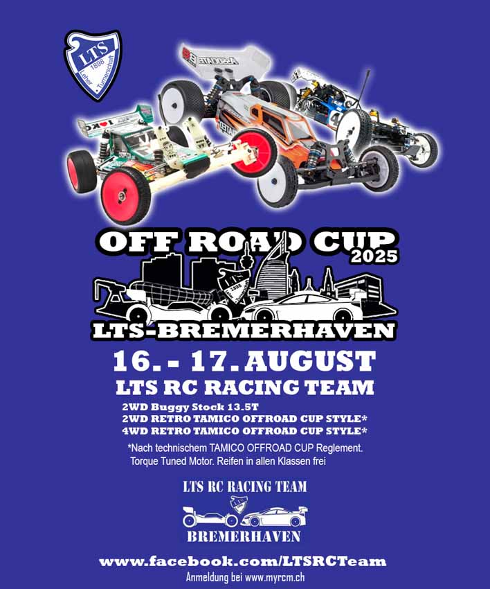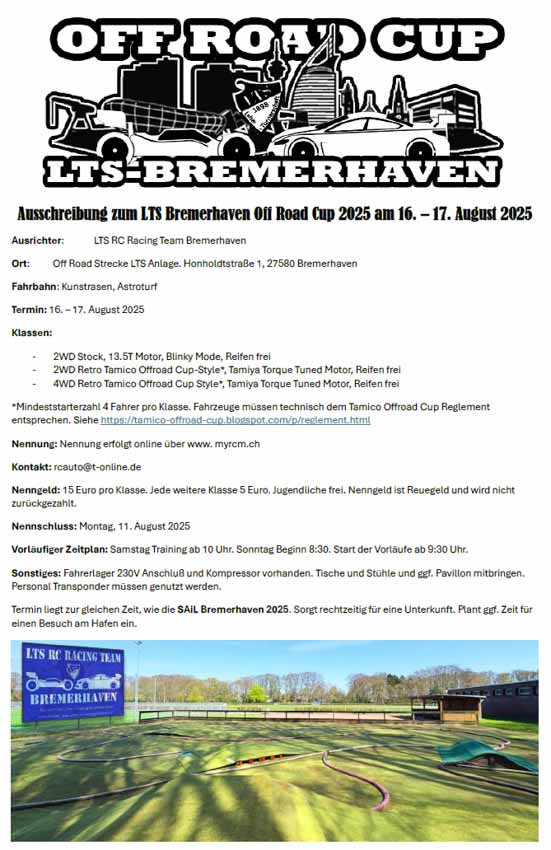 Das LTS RC Racing Team Bremerhaven richtet am 16. – 17. August 2025 ein Off Road Rennen aus. Es werden die 3 Klassen. 2WD 13.5T Stock, sowie 2WD und 4WD Retro nach Tamico Offroad Cup Reglement gefahren. Es erwartet Euch eine neue Strecke und jede Menge Action! Achtung! Am gleichen Wochenende findet auch die SAIL 2025 Bremerhaven statt. Plant es mit ein und sichert Euch rechtzeitig eine Unterkunft.