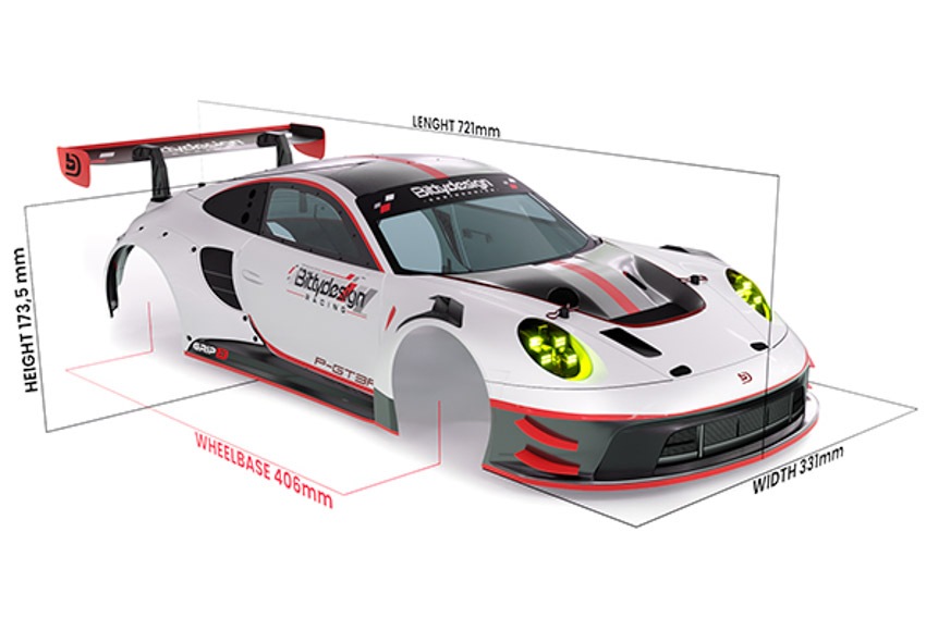 Born from the desire to create an extraordinary product developed specifically for ARRMA, with the main intention of offering an iconic body shape for fans of real GT3 racing cars; during the design process, we thought about every possible detail, which led us to include, along with the body shell, parts that complete the unmistakable style of the P-GT3R and its racing look: