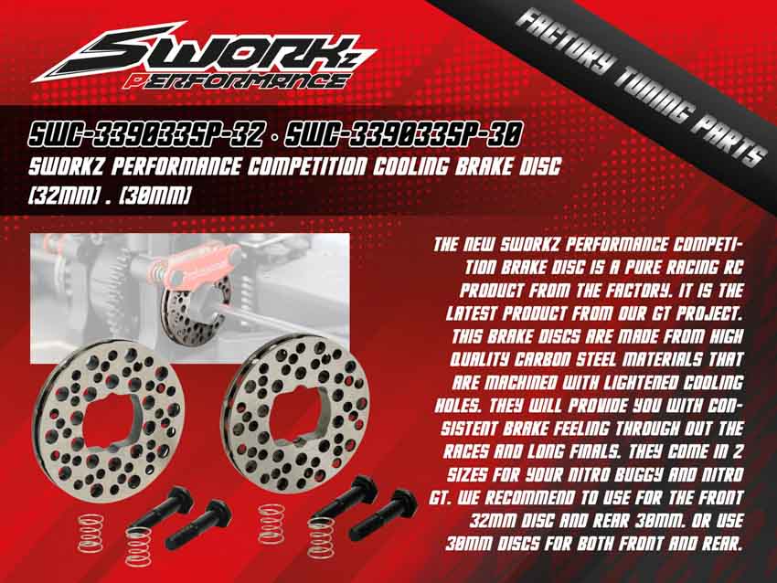 The new SWORKz Performance Competition Brake Disc is a pure racing RC product from the factory. It is the latest product from our GT project. This brake discs are made from high quality carbon steel materials that are machined with lightened cooling holes. They will provide you with consistent brake feeling through out the races and long finals. They come in 2 sizes for your nitro buggy and nitro GT. We recommend to use for the front 32mm disc and rear 30mm. Or use 30mm discs for both front and rear.