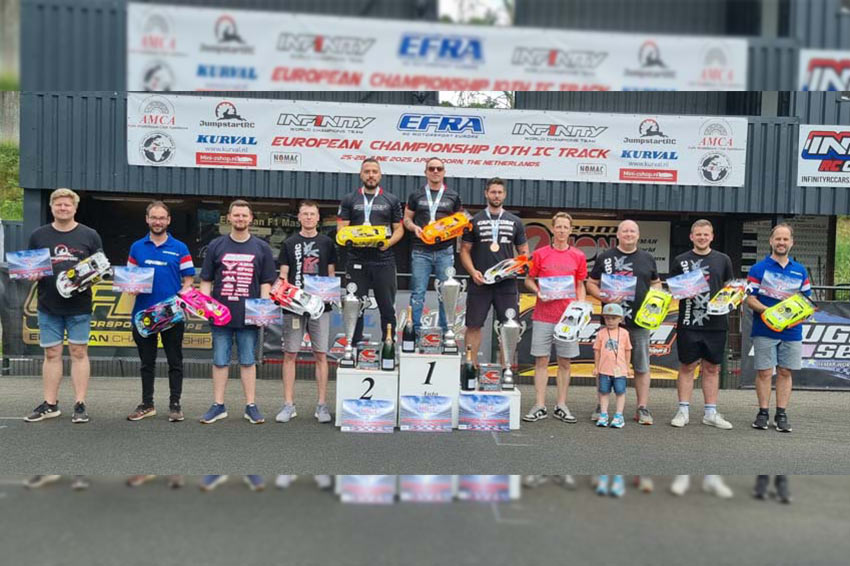 Gestern ging die EFRA Euopameisterschaft Nitro 1/10 Onroad in den Niederlanden zu Ende. Am Ende triumphierten mit Dario Balestri und Carmine Raiola (2) zwei italienische Fahrer. Toni Gruber kam auf den dritten Platz. Insgesamt war das deutsche Team sehr stark. Mit Jakub Rozycki (4), Tim Benson (7), Rene Püpke (9), Melvin Diekmann (10) und Thilo Diekmann (12) waren es insgesamt 6 Fahrer, die aus Deutschland im Finale waren.