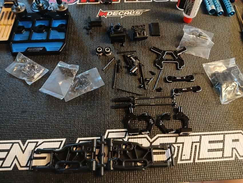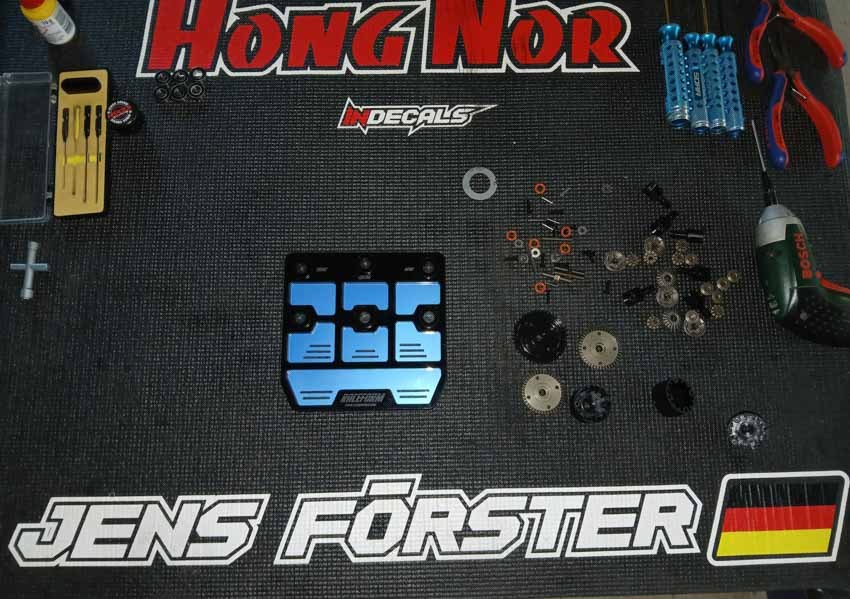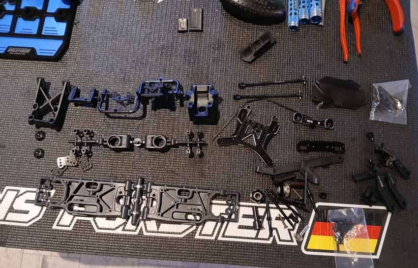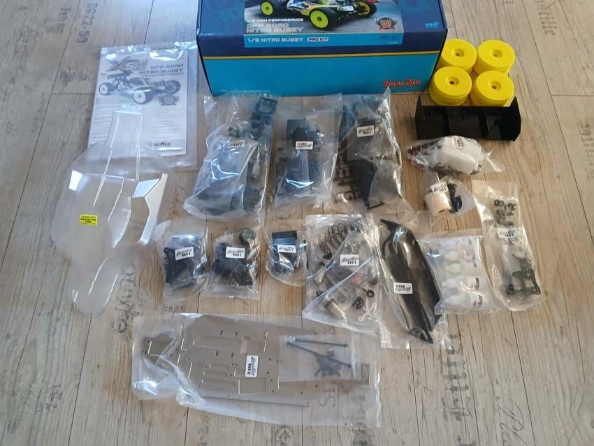 Bei dem Fahrzeug handelt es sich um einen Bausatz, bei dem der Motor, Resorohr, Krümmer, die beiden Servos, der Empfänger,  Sender, Akku, Reifen und die Farbe für die Karosserie fehlen. Genauso fehlt das Zubehör, womit ihr das Fahrzeug startet und tankt.