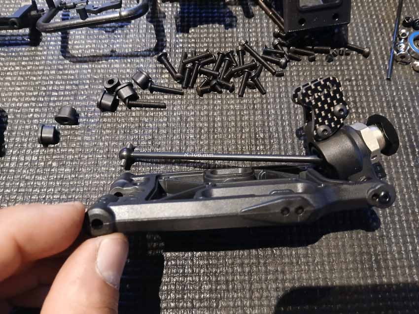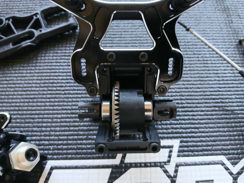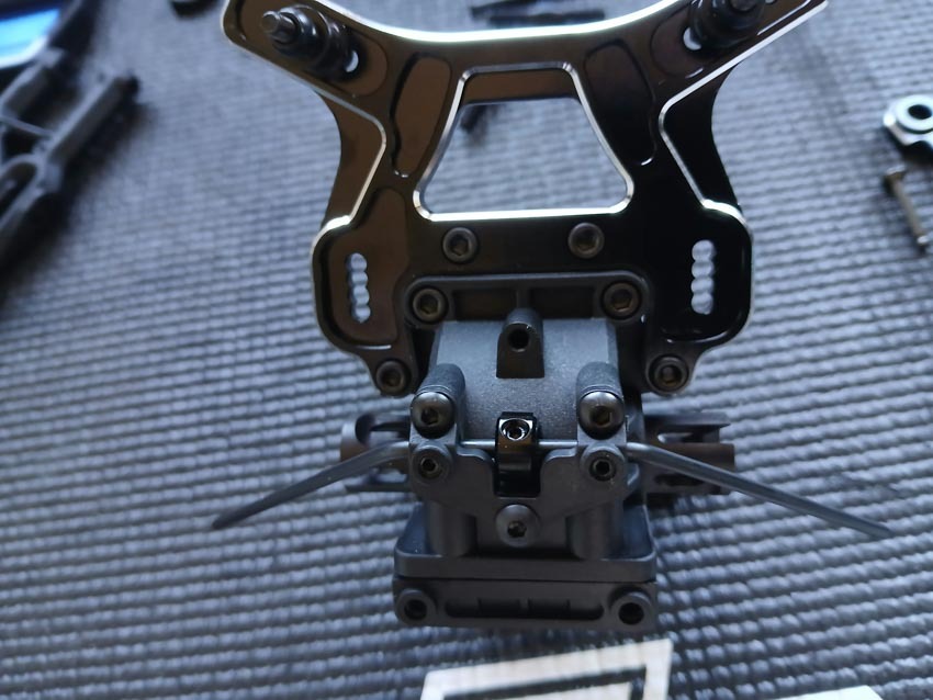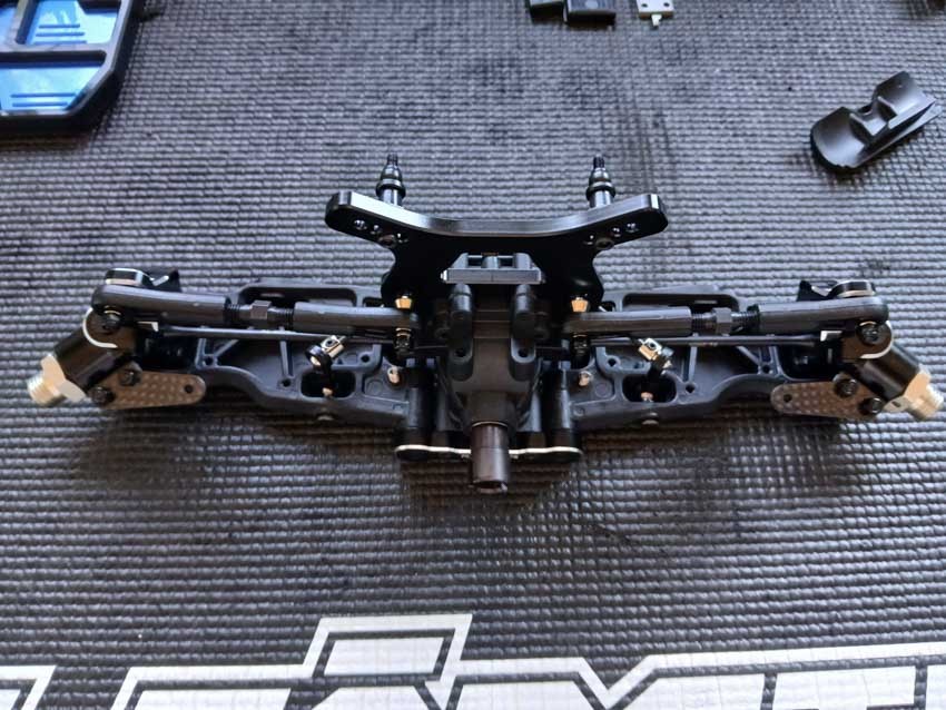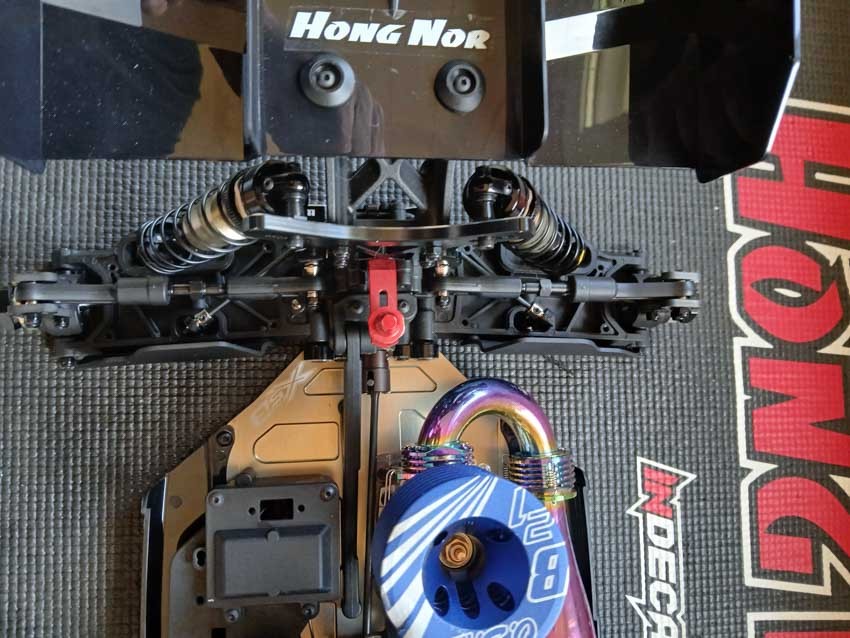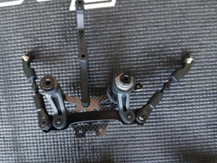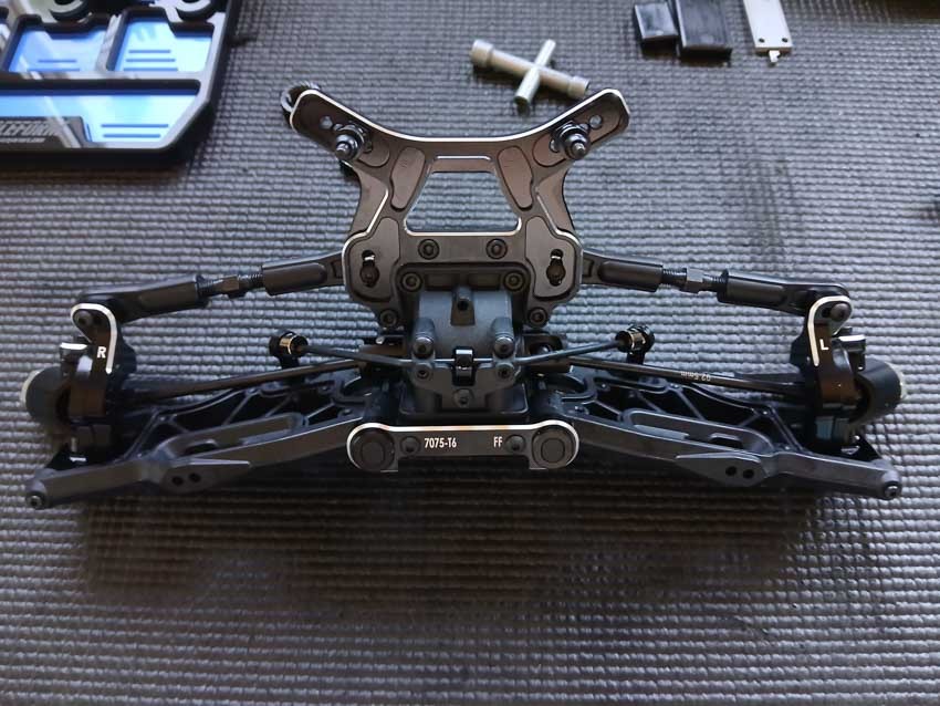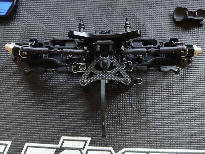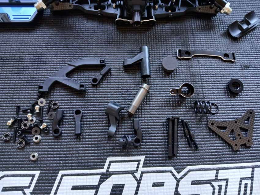 Dafür bietet das Fahrzeug durch die einstellbare Aufhängung viele weitere Einstellmöglichkeiten, wie durch die Einsätze in den Schwingenstiften, dann den Kohlefasereinsätzen für die Querlenker (damit werden diese steifer – optional erhältlich)) oder auch den einstellbaren C-Hubs, welche in den Gradzahlen von 15 / 17,5 bis 20 Grad im Nachlauf einstellbar sind.