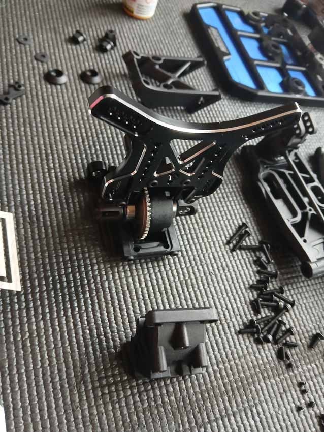 Die Differenziale sind einfach demontierbar, um das Difffett zu wechseln. Vier Schrauben und den Stabi lösen und schon bekommt ihr diese aus dem Differenzialkasten. Der Spoilerhalter ist in der Höhe / Winkel verstellbar. Die Stoßdämpfer sind als luftgefüllter Dämpfer oder als luftloser Stoßdämpfer aufbaubar. Der Tank ist als Pendeltank aufgebaut. Für den Motor liegt eine 4-Backen Kupplung bei. Bei der Platzierung für den Empfänger und den Empfängerakku bieten die  Empfängerbox und das Akkufach recht guten Platz.