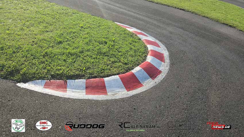 Hier nun zurück zur diesjährigen DM und der Strecke. Gefahren wurde auf einer Asphaltstrecke, welche eine Streckenlänge von 192 Metern hat. Die vielen Kurvenpassagen mit den unterschiedlich hohen Curbs und der Wiese neben der Strecke sind ein Leckerbissen. Dies erforderte an die Fahrer eine hohe Konzentration, um nicht an den Curbs abzufliegen oder im Gras zu landen.