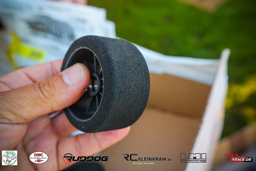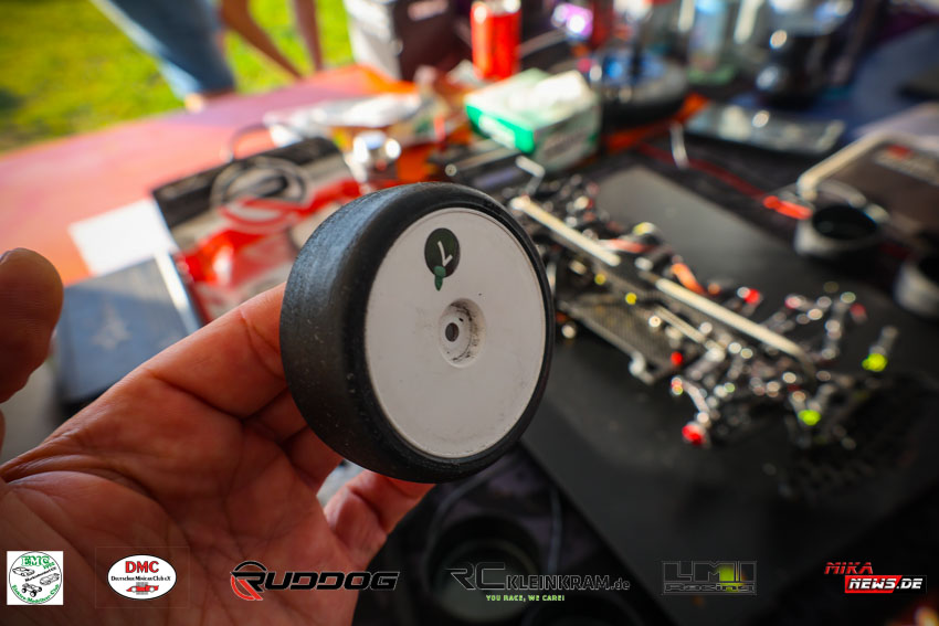 Danach begann pünktlich um 9 Uhr der fünfte und letzte Vorlauf. Davon werden vier gewertet, was die Sache sehr spannend macht. Bei den Reifen sind die Fahrer begrenzt. Insgesamt stehen zwei Satz in allen Klassen zur Verfügung. In den TW-Klassen werden die Ruddog RR36X, in FWD der RCK -36A XLT und bei Formel die Matrix Reifen gefahren. Diese können auf dem Schmiertisch mit dem bereitgestellten Haftmittel geschmiert werden, was alle machen. Die meisten Fahrer heizen danach die Reifen. In den A-Finale bekommen die TW noch einen Satz zusätzlich (nicht FWD). Nur in Modified ist in jedem Finale ein neuer Satz erlaubt. Hier muss niemand sich Gedanken über die Reifenstrategie machen. Doch zuvor geht es im letzten Vorlauf um die Finalplätze und die Startaufstellung.