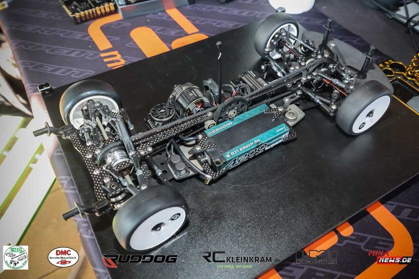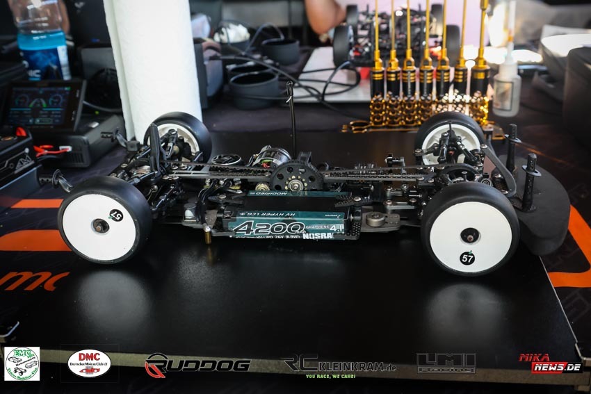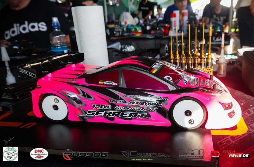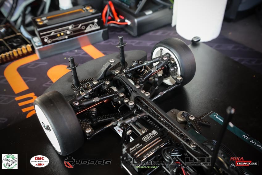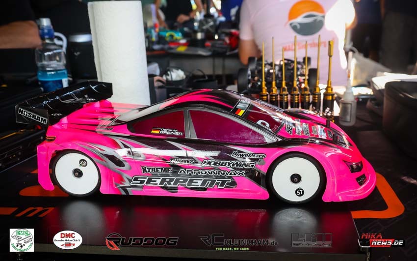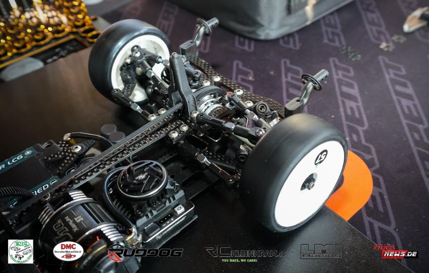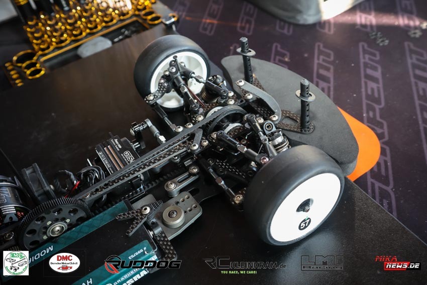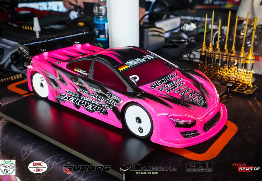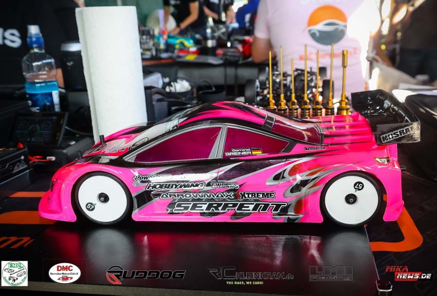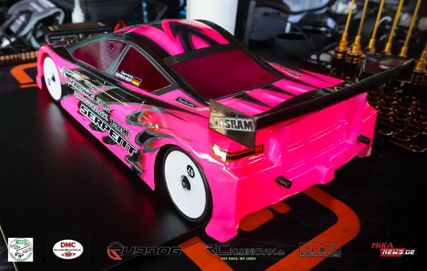 Dominic fuhr seinen Serpent Medius X25 mit neuen Teilen. Darunter ist die einstellbare Aufhängung an den oberen Querlenkern. Damit lässt die Vorder- und Hinterachse noch besser und genauer einstellen. Zusätzlich hat er noch Teile als 3D Druck zur Karosserieabstützung vorne und hinten verbaut. Ihr wisst ja sicher, dass leichte Karosserien gefahren werden, die sich jedoch leicht „verbiegen“. Da ist eine Abstützung hilfreich.