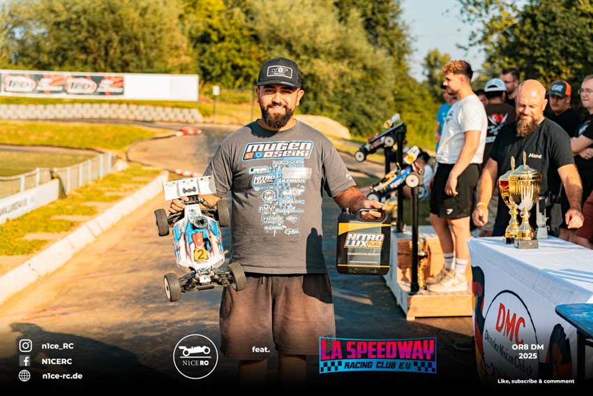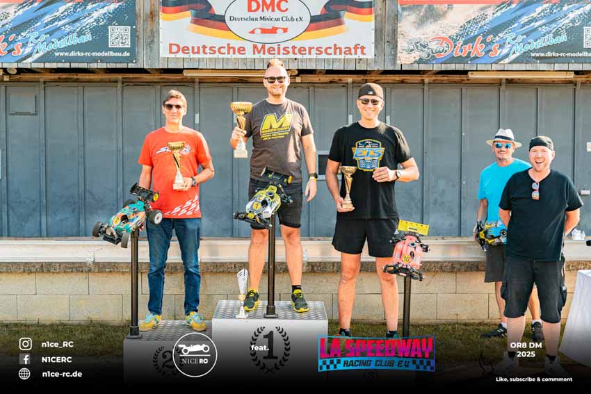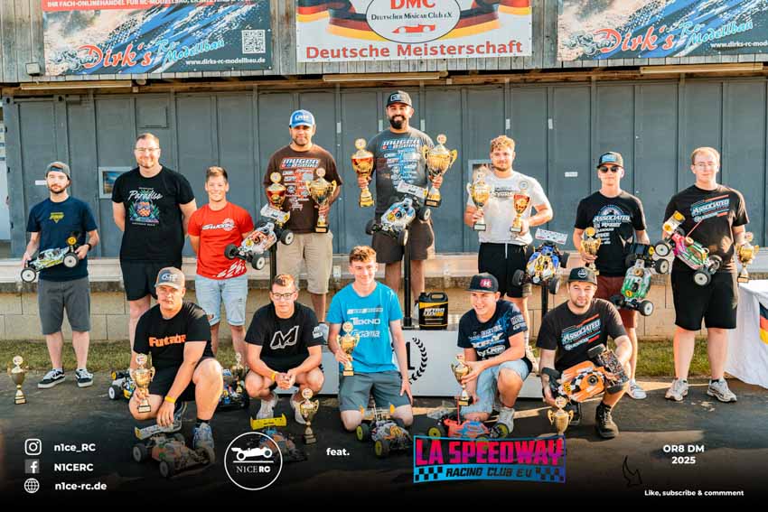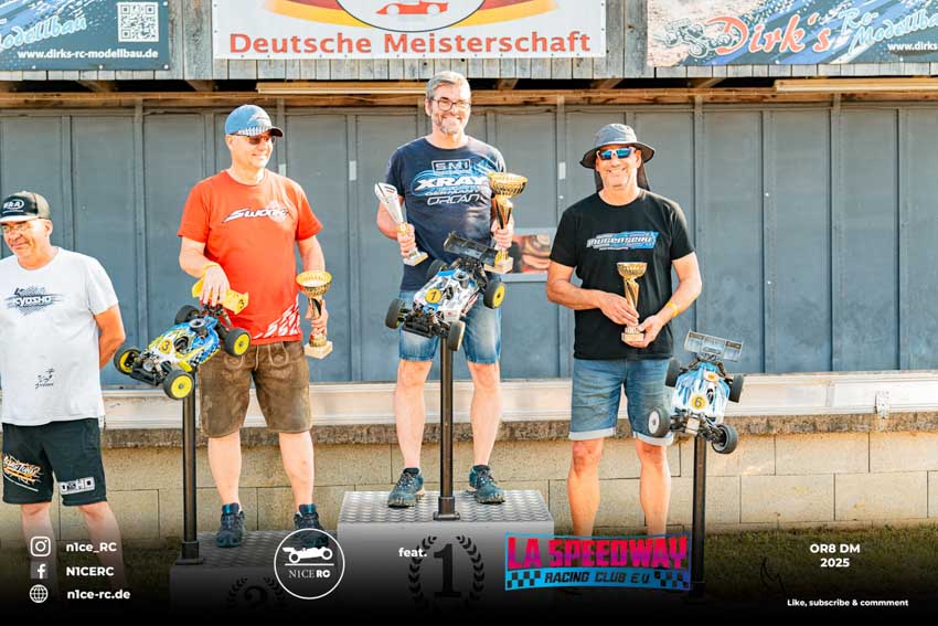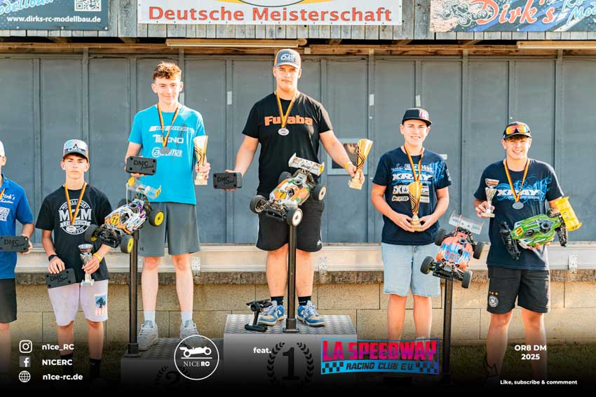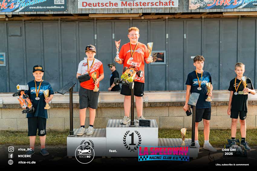 Nach Fahrerpräsentation und Fotosession stieg die Spannung zum Höhepunkt, der Titelentscheidung um die Deutsche Meisterschaft OR8. Schon in der ersten Runde musste der von P1 gestartete Haatanen seine Führungsposition an Burak Kilic abgeben und sich vor Berkan Kilic auf dem zweiten Rang einreihen, aber auch das nur bis zur dritten Runde. Ein Motor-Absteller warf ihn mit einer 1:30-er Runden auf den 13. und letzten Platz zurück. Während die Kilic-Brüder fortan ungefährdet ihre Runden an der Spitze des Feldes drehten, verabschiedeten sich nach Haatanen mit Rönick und Hesse zwei weitere Mitfavoriten durch ein Motor-Aus frühzeitig aus dem Titelkampf. Nach 65 Runden überquerte Burak Kilic, der ältere der Kilic-Brüder, als Erster die Ziellinie und eroberte damit seinen dritten Titel als Deutscher Meister in der Klasse OR8 ach 2019 und 2022. Von seinem zweitplatzierten Bruder Berkan trennten ihn 15 Sekunden. Auf seiner Hausbahn drehte Tim Kraus mit beachtlicher Konstanz 66 Runden und erntete als Lokalmatador für seinen dritten Platz wohlverdienten Applaus. Haatanens bemerkenswerte Aufholjagd, bei der er auch die schnellste Rennrunde drehte, endete nach 66 Runden auf Rang vier. Ebenfalls mit 66 Runden fuhr Rönick auf Rang fünf. Die weiteren Plätze belegten als bester Jugendlicher Milde, Hesse, Krüger, Schwartz, Bauer, Scheuenpflug und Krause. Einzig Waitz konnte das Rennen nicht beenden und musste sein Auto bereits nach knapp zwölf Minuten abstellen.