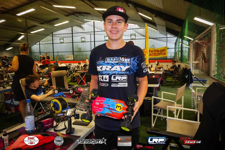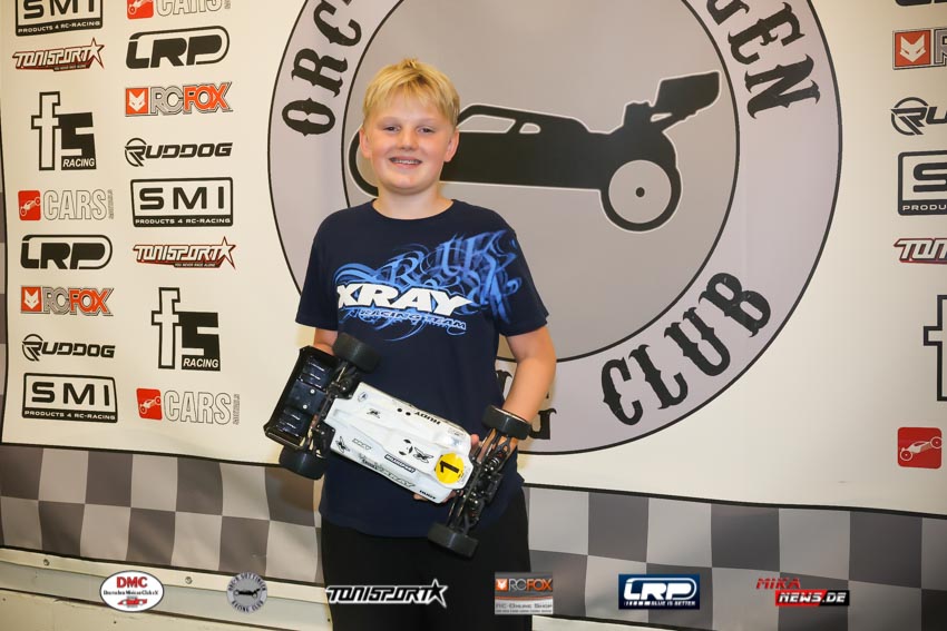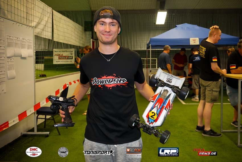 Im zweiten und dritten Vorlauf ging es weiterhin spannend weiter. Zwar konnte sich Jörn Neumann mit zwei weiteren Laufsiegen bereits vorzeitig den TQ in TR2 sicher, jedoch wurde es in 4WD interessant. Nachdem Sören Sparbier den zweiten Vorlauf gewann und im dritten Vorlauf auf TQ war, ereilte ihn nach einem Überschlag der „Ausfall“. Die Chance nutzte Louis Mobers, um nach einen durchwachsenen Rennen, doch noch den Sieg vor Aaron Waitz zu holen. Das war ein auf und ab für Louis gewesen. Nun gehts in den letzten beiden Vorläufen um den Kampf um den ersten Startplatz weiter. In der schnellsten Gruppe 8 der 4WD`s war es Joona Haatanen, der keine Fehler machte. Jörn Neumann dagegen hatte an der Brücke zu Beginn und dann in der letzten Runde unten einen dicken Fehler im Lauf, was ihn auf Platz 3 zurückschob. Joona Haatanen siegte vor Julius Stein, der wieder eine super Leistung zeigten konnte. Julius, der zweimal hintereinander deutscher Meister ORE2WDST wurde, wechselte in Modified 2WD und 4WD. Mit viel Training fand er schnell den Anschluss an die schnellen Jungs, wie man an diesem Wochenende sehen kann.
