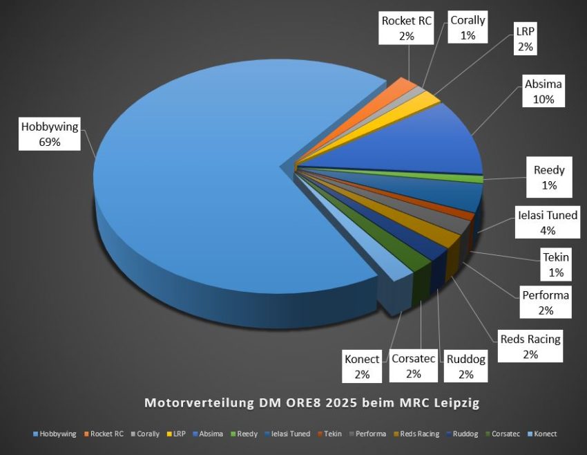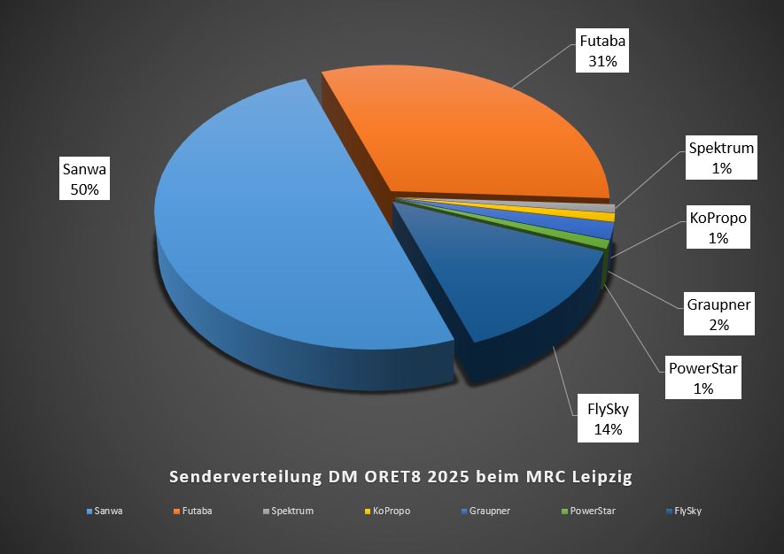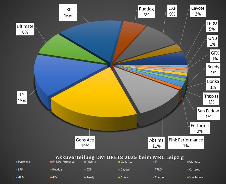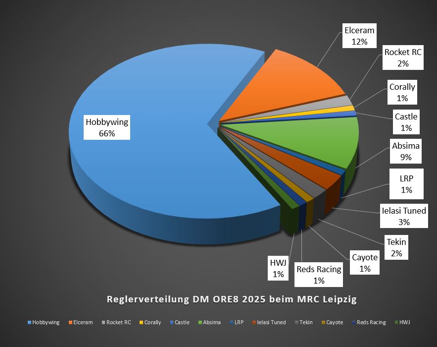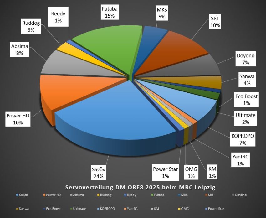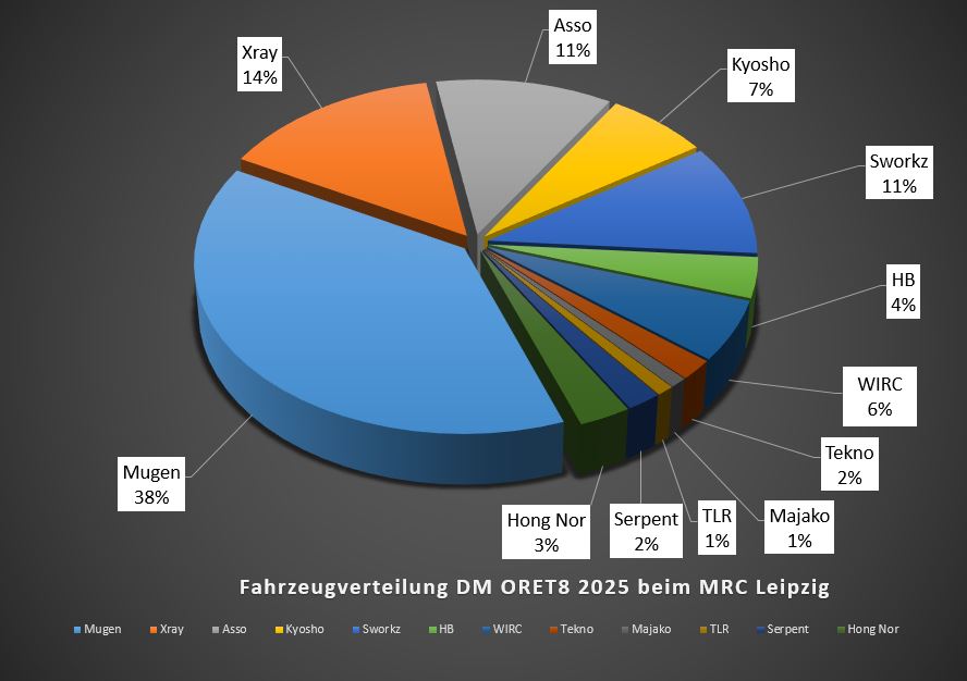 Die DM ORE8 2025 beim MRC Leipzig wurde am letzten Wochenende ausgetragen. Dort setzten die Teilnehmer unterschiedliche Fahrzeuge und Technik darin ein. Hier erfahrt ihr mehr darüber. Ich habe ein paar Diagramme erstellt. Darin findet ihr hier prozentuale Verteilung.