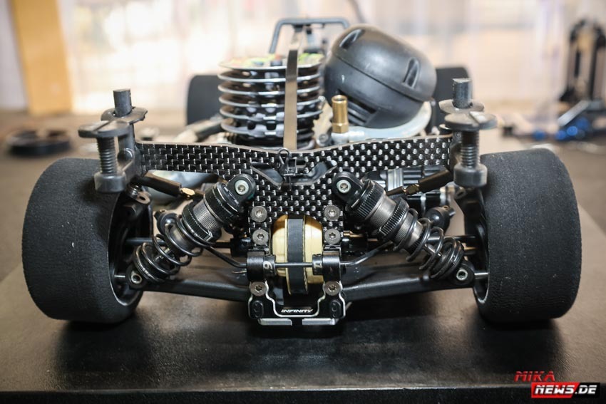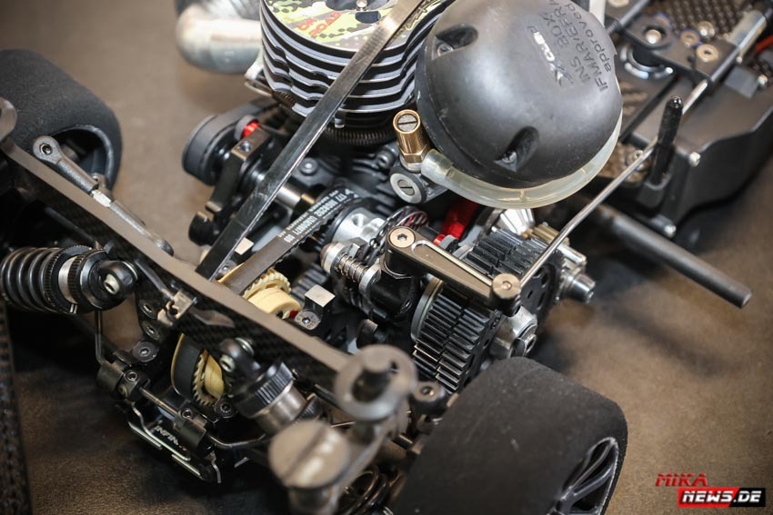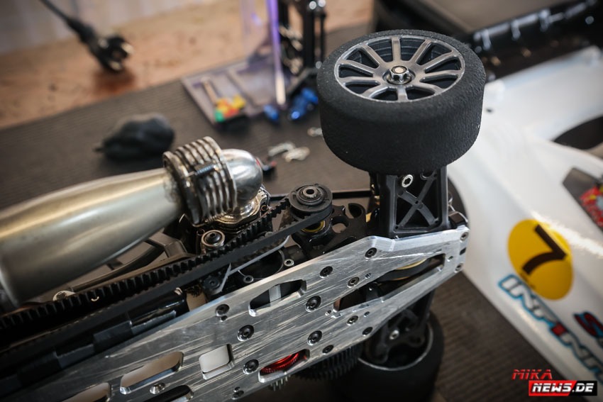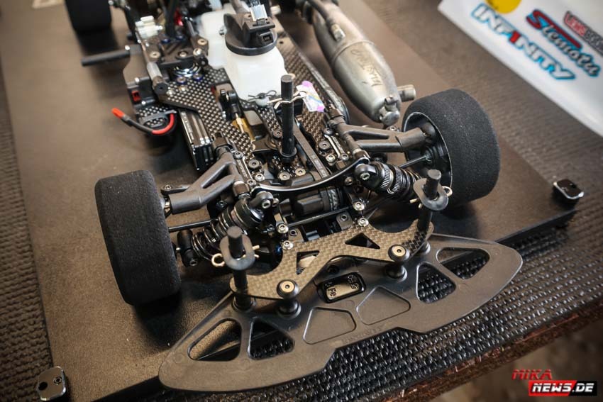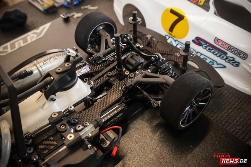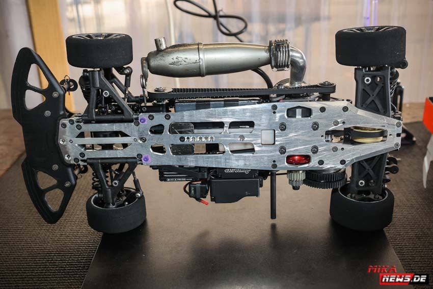 Er hat u.a. an seiner Chassisplatte hinten die Querstrebe entfernt und vorne die „Versteifungsstrebe“ montiert.