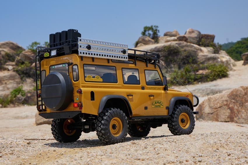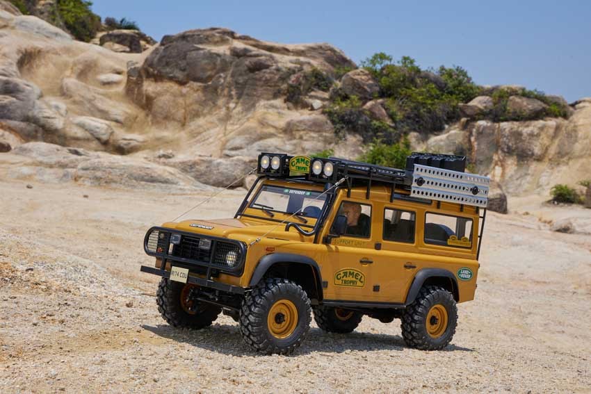 sich über die Fernsteuerung schalten. Zusätzlich sorgen Spotlights auf dem Dachgepäckträger für stimmungsvolle Nachteinsätze. Die beiliegenden Camel Trophy-Zubehörteile unterstreichen das Abenteuer-Flair jedes Modells.