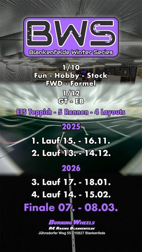 In dieser Wintersaison steht die BWS bei einem neuen Verein auf dem Terminplan. Die Burning Wheels Blankenfelde werden 5 Rennen austragen und dies auf vier verschiedenen Streckenführungen. Merkt euch die Termine vor.