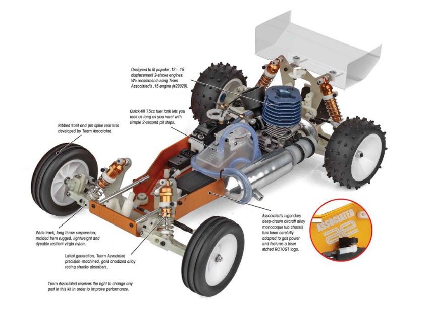 BITTE BEACHTEN SIE: Der RC10GB-Bausatz enthält keinen Motor, aber einen Krümmer und ein Auspuffrohr.Dazu den passenden Motor erwerben oder das System anpassen.