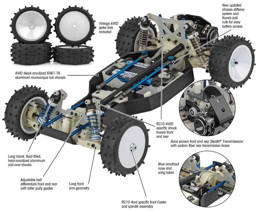 The iconic RC10 is now available as a 4WD race buggy with everything included in one box. No need for a conversion kit or sourcing rare parts. Build a high-performance race buggy from the 90s that is meant to be raced, using the latest electronics of your choice (electronics not included; fits 6-cell NiMh and 2S LiPo batteries).