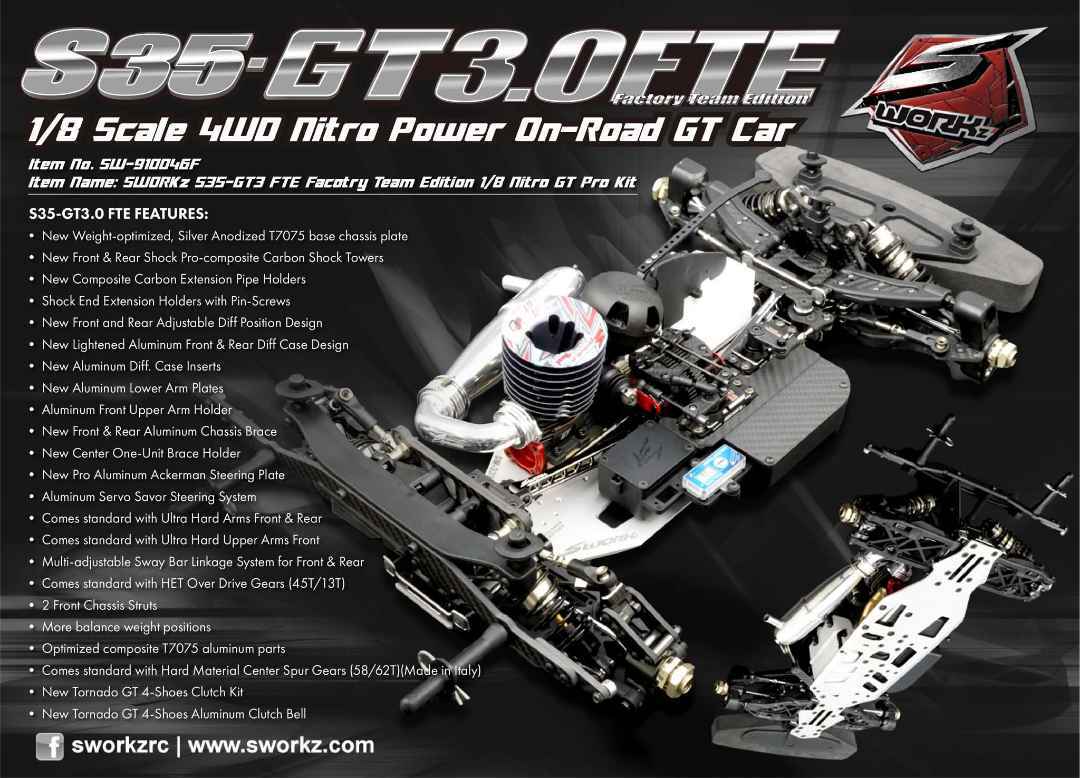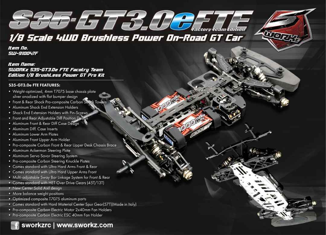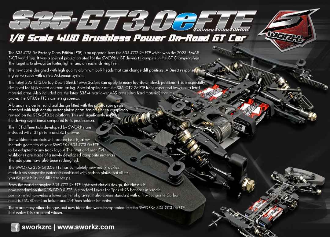 Die S35-GT3.0e Factory Team Edition (FTE) ist ein Upgrade der S35-GT2.2e FTE, die den IFMAR E-GT Weltcup 2023 gewonnen hat. Es handelt sich um ein spezielles Projekt, das für die SWORKz GT-Fahrer entwickelt wurde, um bei den GT-Meisterschaften anzutreten. Ziel ist es, stets schneller, leichter und mit einem einfacheren Fahrgefühl unterwegs zu sein.