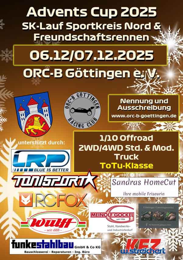 Der ORC-B Göttingen lädt im Dezember zum Avents Cup 2025 ein. Das Rennen findet am 06./07.12.2025 statt. Lasst eure Buggys nicht verstauben, sondern nutzt die Gelegenheit beim ORC-B Göttingen am Start zu sein und die Bahn unsicher zu machen. Der Verein freut sich auf ein tolles und gemeinsames Adventswochenenden mit euch.