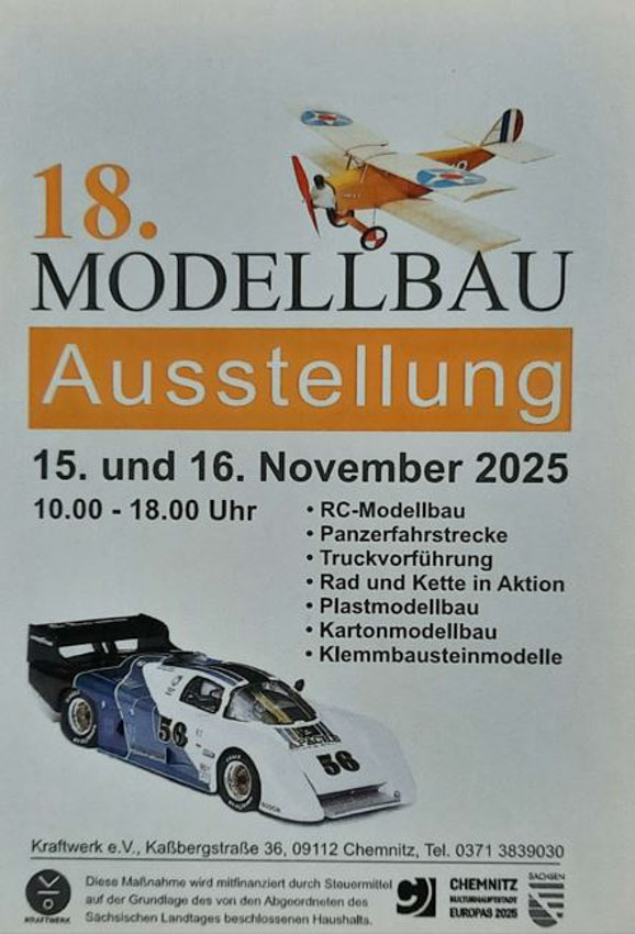 Am Wochenende, den 15./16.11.2025 steht die bereits 18.Modellbau-Ausstellung in Chemnitz an. Dazu lädt das Kraftwerk e.V. ein. Bei dem Event erwarten Euch viele Facetten des Modellbaus, wie eine Panzerfahrstrecke, Truckvorführungen, Rad und Kette in Aktion, Plastmodellbau, Kartonmodellbau und die Welt der Klemmbausteine. Die Öffnungszeiten sind 10-18 Uhr.