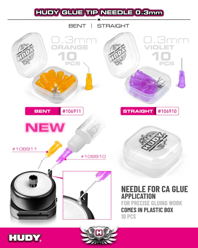 HUDY hat zwei verschiedene „Düsen“ für die gängisten Sekundenkleber auf den Markt gebracht. Einfach aufstecken und dann gezielt den Kleber zum Beispiel zwischen Felge und Reifenflanke bringen. Diese gibt es mit gerade und gebogener Spitze als 110er Pack.