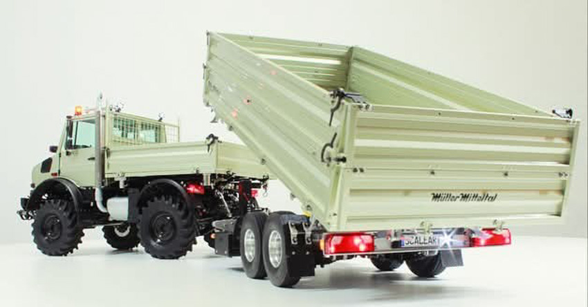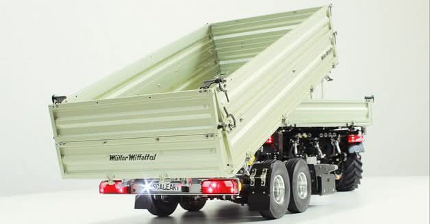 Von ScaleART kommt ein für UNIMOG passender 2-Achs Tandemkippanhänger nach Müller-Mitteltal Vorbild – eine optisch und technisch schöne Kombination mit vielen Details, Licht und Hydraulik.