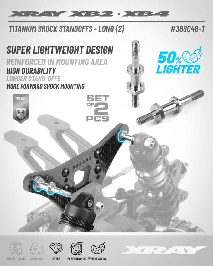 XRAY präsentierte heute aus Titan spezielle Dämpferhalter für den XB2 & XB4 als Long-Version. Es sind zwei Stück in einer Tüte erhältlich.