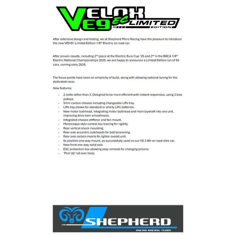 Produktinformationen Velox Ve9 2026 Race Kit präsentiert 22. Dezember 2025 Micha Von Sheperd Micro Racing wird es einen Elektro 1/8 Onroader geben. Hier Infos dazu. Quelle: Team Shepherd Racing / Zen Racing Category PostsBaruffolo wechselt zu JETKO PowerWolhuter im TEAM KYOSHO INTERNATIONALSerpent SRX8GTE R ist daSteven Weiss Joins RC Maker1991 RC10 Stealth Car Masami Edition ist daAtomic BZ Master Edition 4WD ChassisNeues Fahrzeug von AE vor Weihnachten!Velox Ve9 2026 Race Kit präsentiertNeue Intellect MC4 LiHV AkkusRC Lemans – Termine und Infos für 2026 Teilen mit: Klick, um auf Facebook zu teilen (Wird in neuem Fenster geöffnet) Facebook Klicke, um auf X zu teilen (Wird in neuem Fenster geöffnet) X