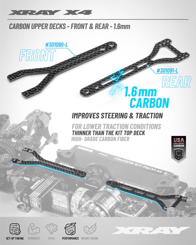XRAY hat heute jeweils ein vorderes und hinteres Top Deck für den aktuellen X4’26 vorgestellt. Diese sind aus Carbon und haben eine Dicke von 1,6 mm. Diese bieten weitere Abstimmungsmöglichkeiten bei Strecke mit wenig Traktion. Weiteres hier dazu (Englisch):