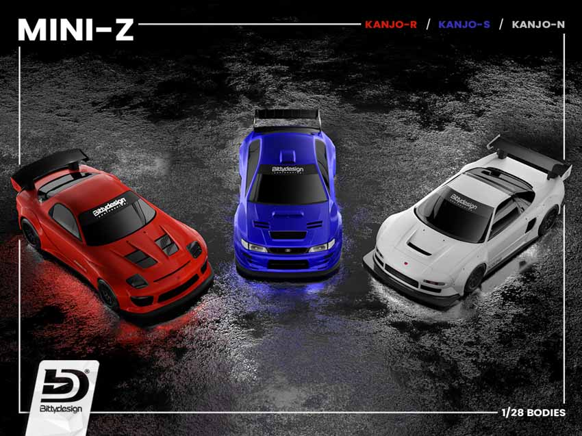Von Bittydesign kommen nun drei neue Karosserien für die beliebten Mini-Z 1/28 Fahrzeuge von Kyosho. Es handelt sich um die KANJO Serie.