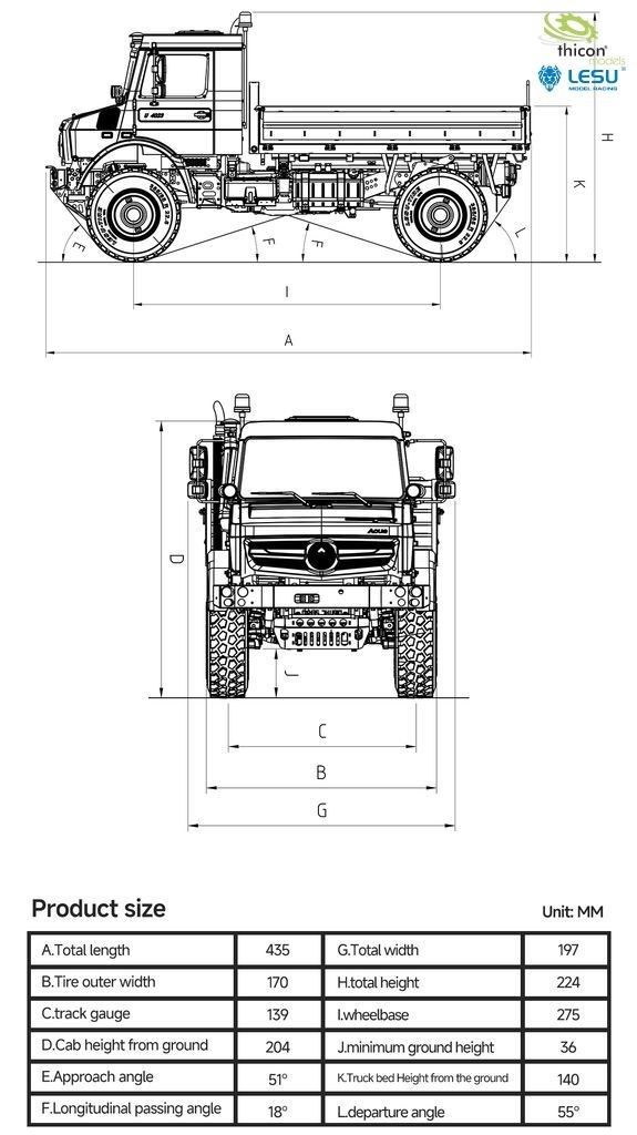 Es ist ein detailierter Gelände-LKW mit fester Pritsche. Das Fahrerhaus ist aus Aluminium und das Fahrgestell aus Edelstahl gefertig. Die Portalachsen sind sperrbar. Der Antrieb verfügt über ein 3-Gang-Getriebe und kann von 4×2 auf 4×4 den Allrad zuschalten.