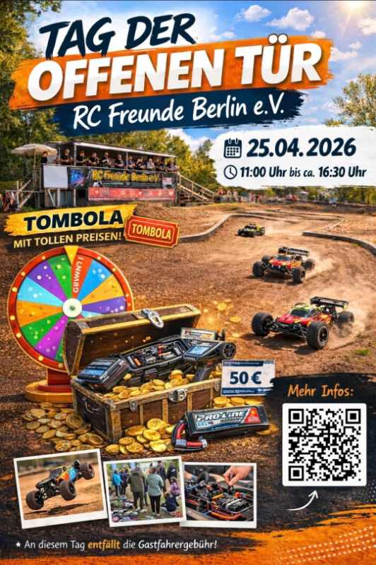 Das erste Highlight für die RC Freunde Berlin e.V. steht am Ende des Monats an. Es ist der Tag der offenen Tür am 25.04.2026 von 11:00 bis 16:30 Uhr auf dem Gelände für euch – egal ob ihr schon RC-begeistert seid oder einfach mal reinschnuppern wollt.