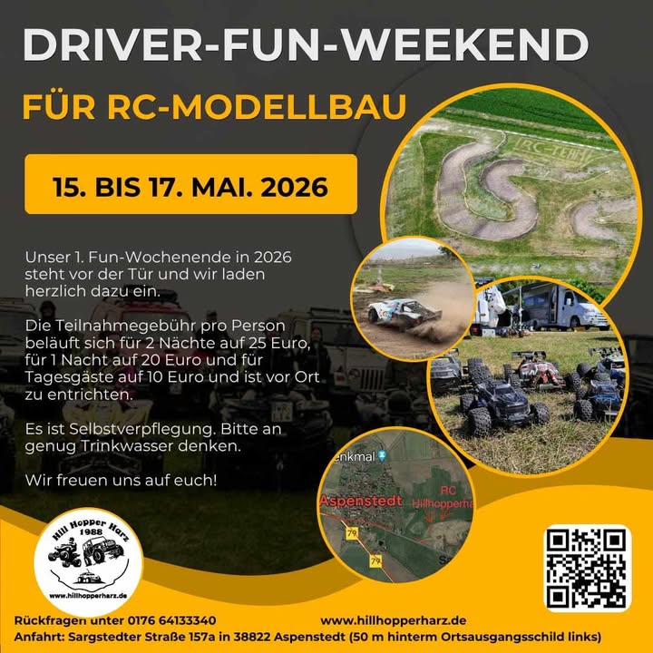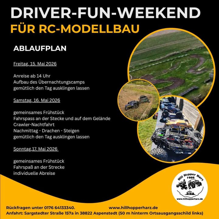 Wie die Überschrift schon besagt, wird es in diesem Jahr ein DRIVER-FUN-WEEKEND bder RC Modellfahrzeuge-Sparte des Hill Hopper Club`s stattfinden. Diese Event wird vom 15. – 17. Mai als erstes Gastfahrerwochenende an der RC-STRECKE ausgetragen werden. Ihr seid herzlichst eingeladen dazu. Infos hier: