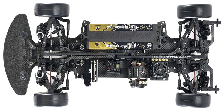 Seht selbst. Das Fahrzeug ist ein Mittelmotor mit unteren Querlenkern aus Kohlefaser und oben einstellbar. Spool vorn und Kegeldifferenzial hinten sind verbaut. Kurze Dämpfer und insgesamt ein flaches Design.