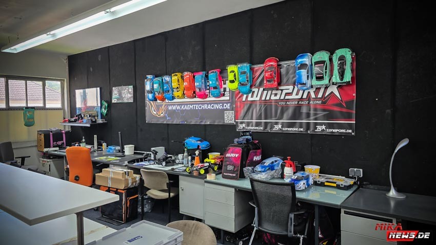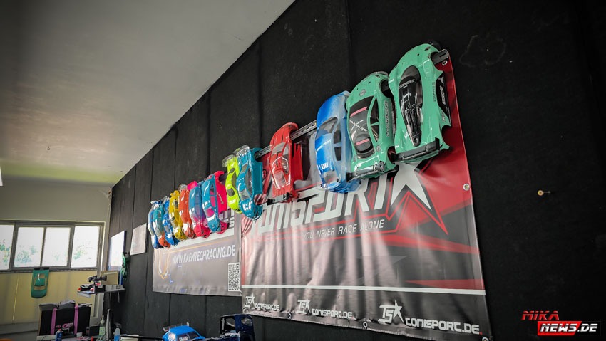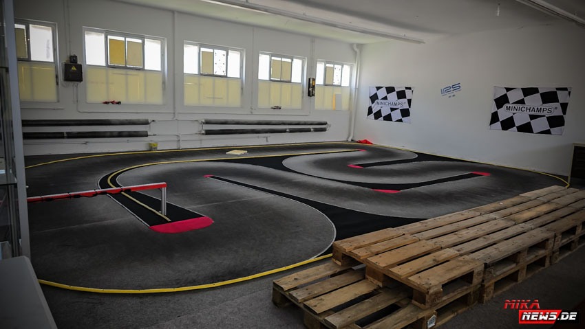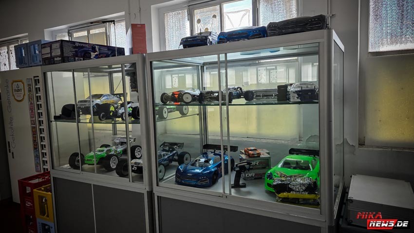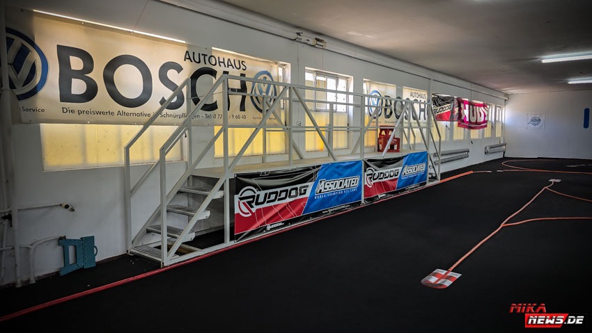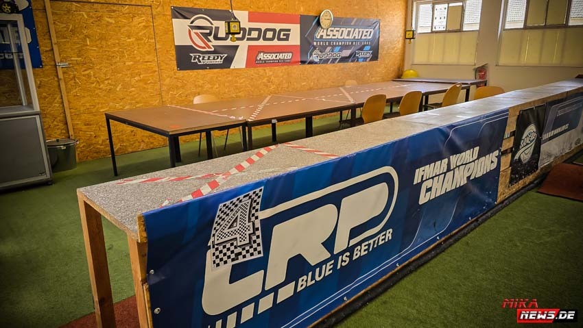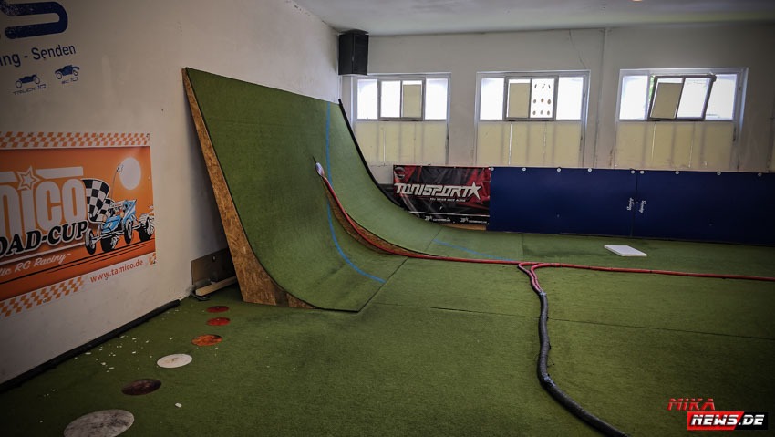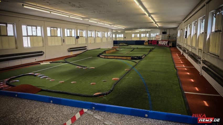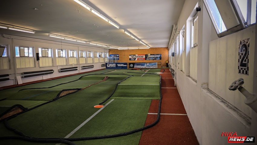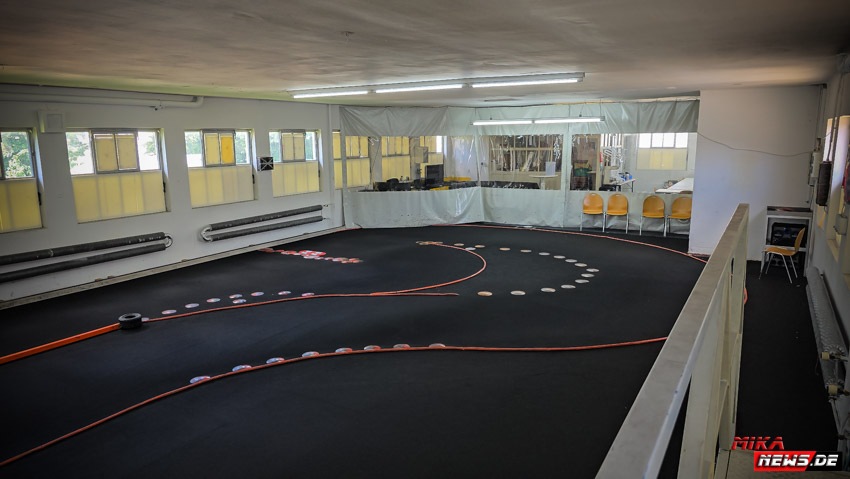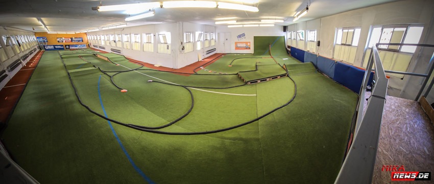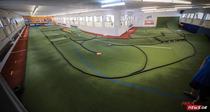 Im oberen Bereich findet ihr zu Beginn ein Fahrerlager mit Tischen, Stühlen und Strom. Daneben gelangt ihr einmal zur Onroadstrecke, dann durch eine Tür zur Mini-Z Strecke und weiter geht es zur Offroadrennstrecke. Wenn ihr das erste Mal vor Ort seid, werdet ihr überrascht sein, was der Verein hier bietet. Gefahren können hier Elektro Off- und Onroader bis zu einem Maßstab 1/10. Eine tolle Anlage die der Verein in Senden für RC Car Fahrer bietet. Als Untergrund liegt Kunstrasen bei den Offroadern und Nadelfilz auf der Onroadstrecke.
