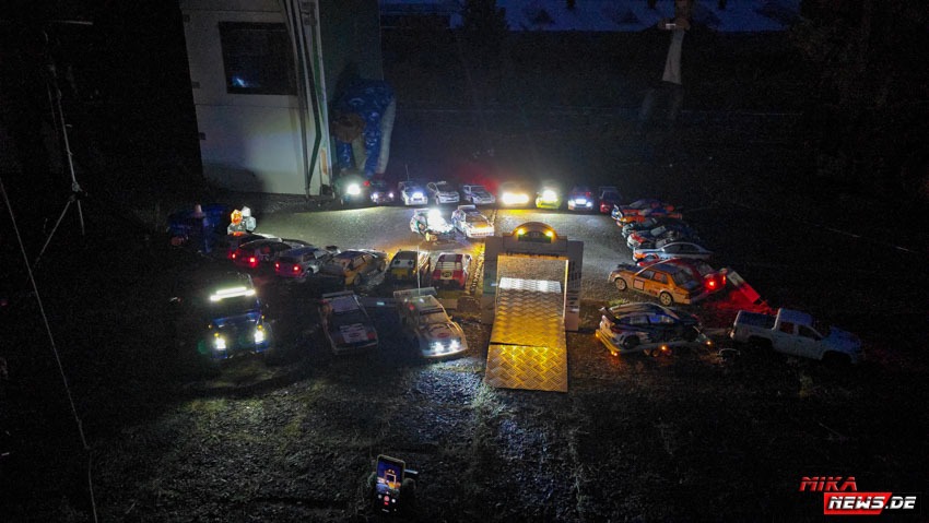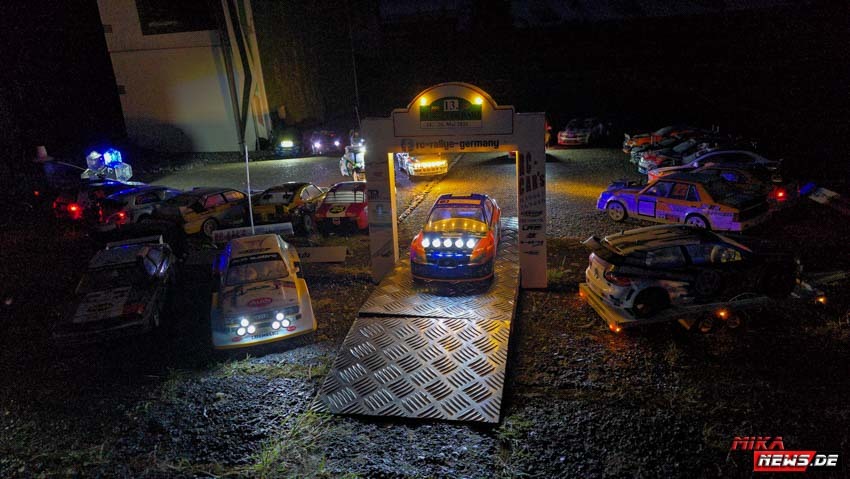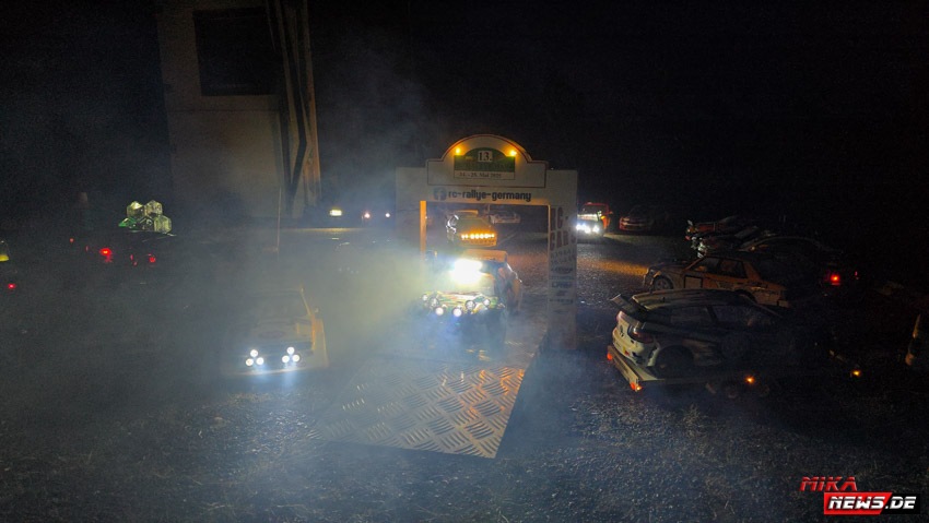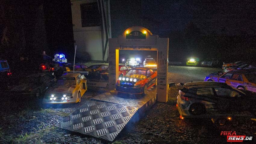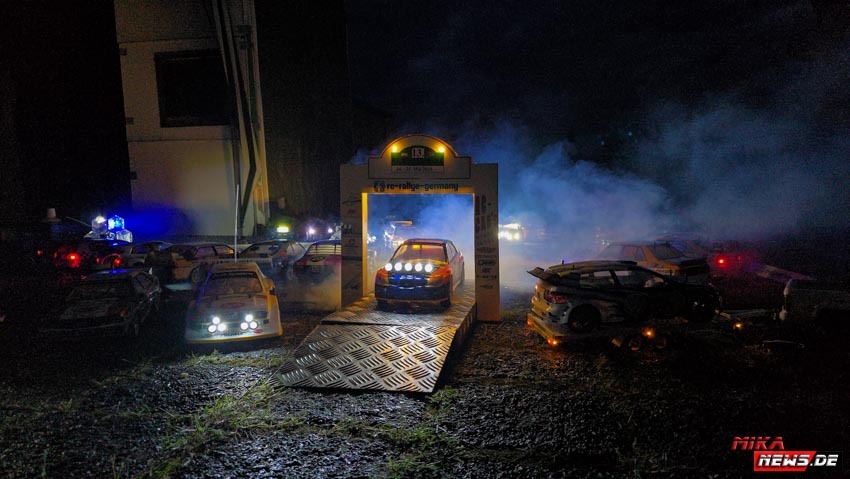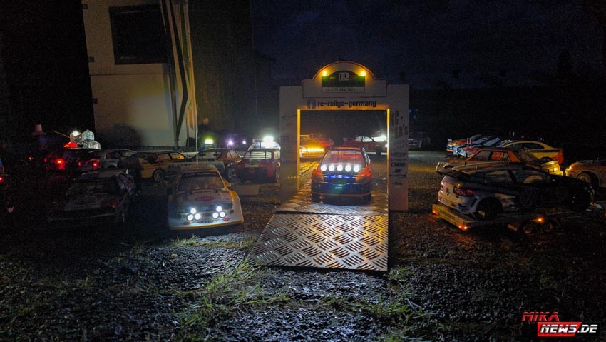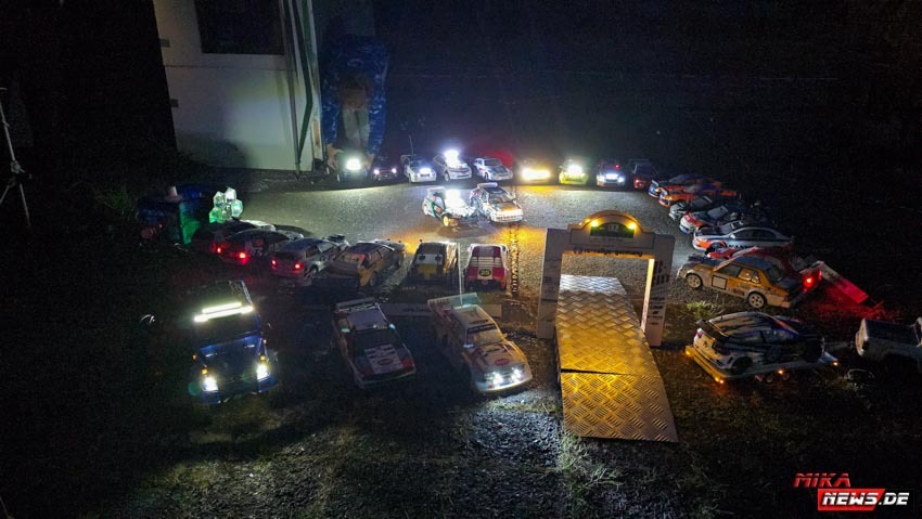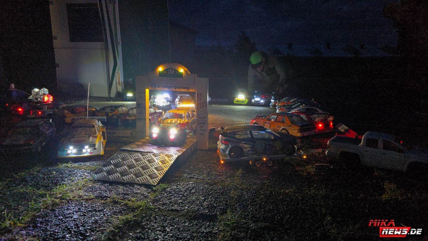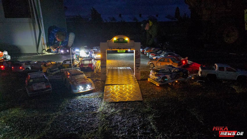 Nach insgesamt 4 WPs war eine längere Servicepause, bevor die Nacht WP gestartet wurde. Da war es wirklich dunkel. Auf der WP waren nur die Scheinwerfer der Fahrzeuge zu sehen. Licht war hier Pflicht. Davor stellte Christian mit einer Nebenmaschine und Licht die Teilnehmer mit den Fahrzeugen vor. Ganz wie im großen Motorsport.