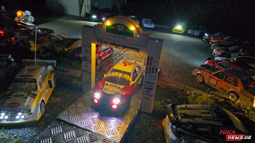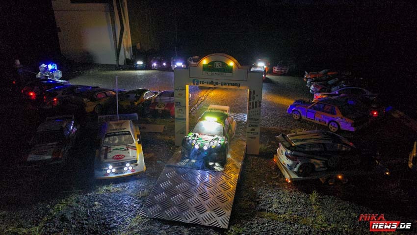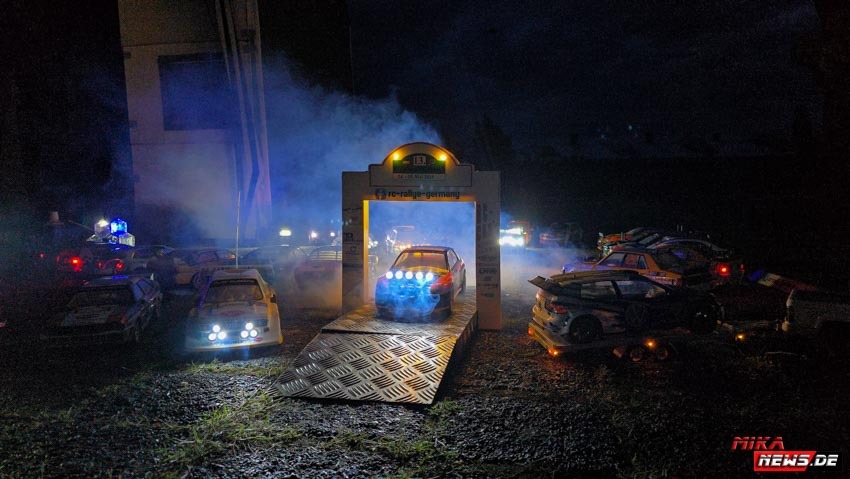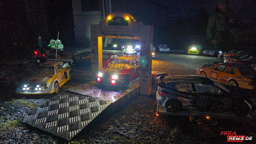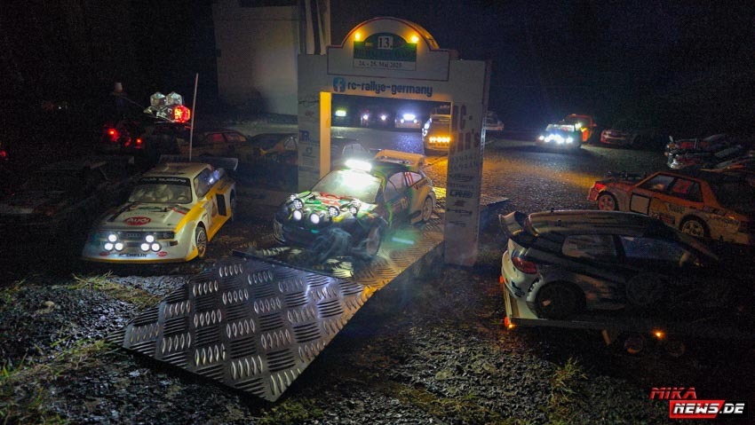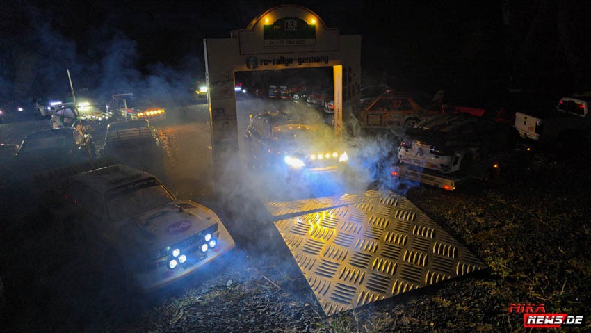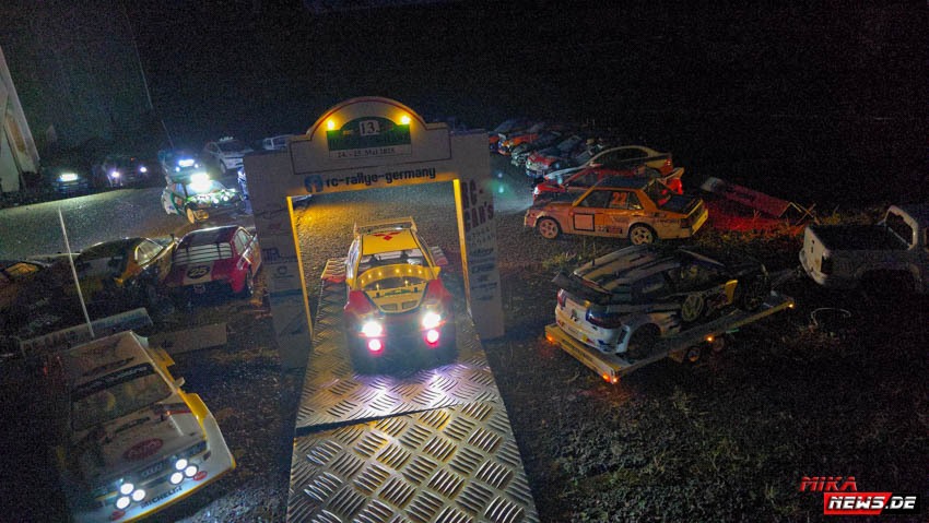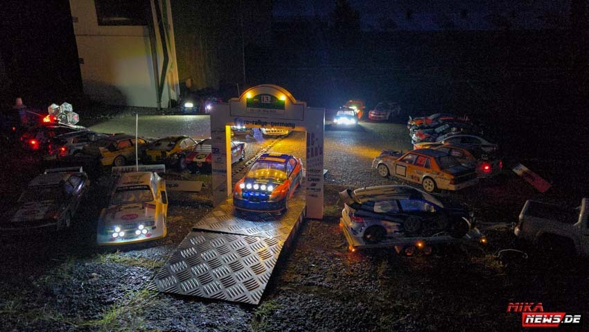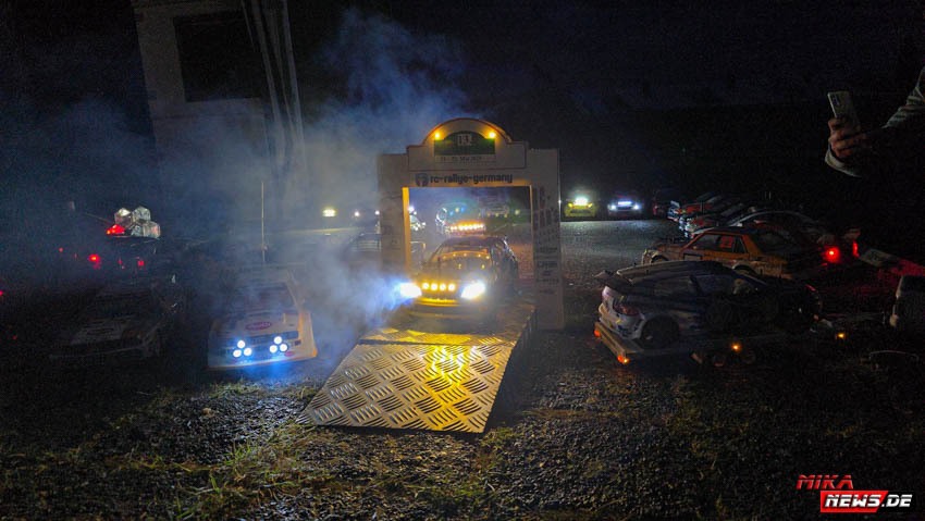 Nach insgesamt 4 WPs war eine längere Servicepause, bevor die Nacht WP gestartet wurde. Da war es wirklich dunkel. Auf der WP waren nur die Scheinwerfer der Fahrzeuge zu sehen. Licht war hier Pflicht. Davor stellte Christian mit einer Nebenmaschine und Licht die Teilnehmer mit den Fahrzeugen vor. Ganz wie im großen Motorsport.