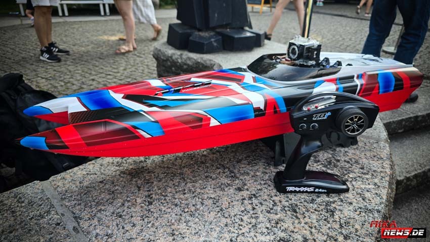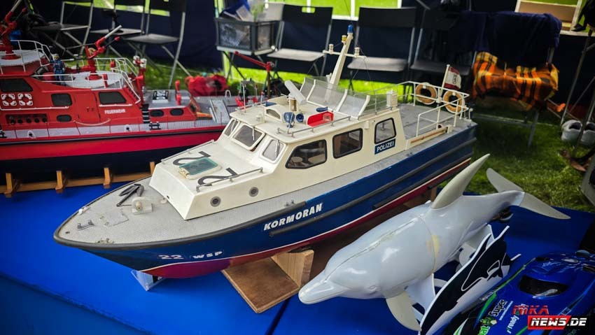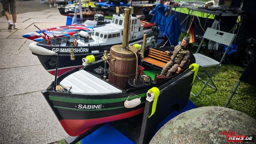 Auf dem Wasser war reger Betrieb, so konnte auch hier den Zuschauern die große Vielfalt der Schiffsmodelle auf dem Wasser in Aktion präsentiert werden. Die Besonderheiten und Funktionsmöglichkeiten der Modelle wurden dem Publikum durch kurze Interviews unserer Moderatoren mit den Modellbootkapitänen näher gebracht.